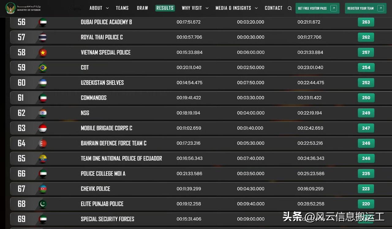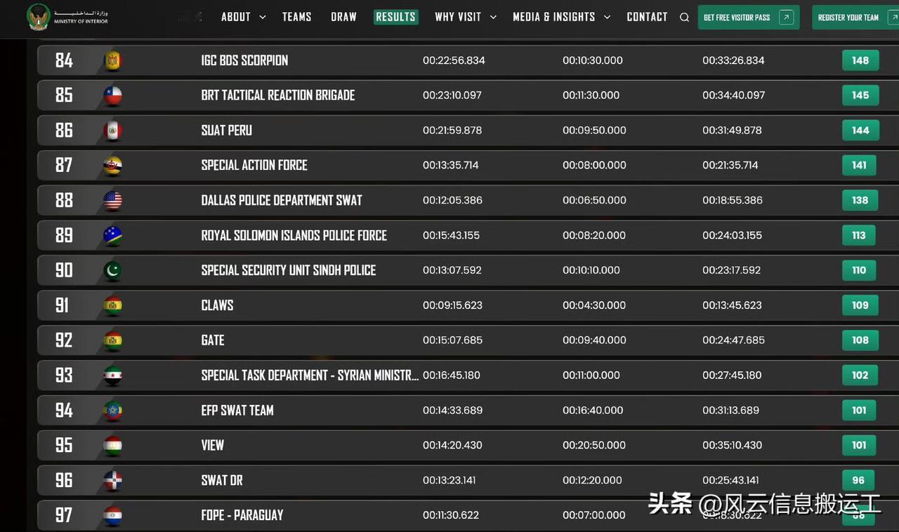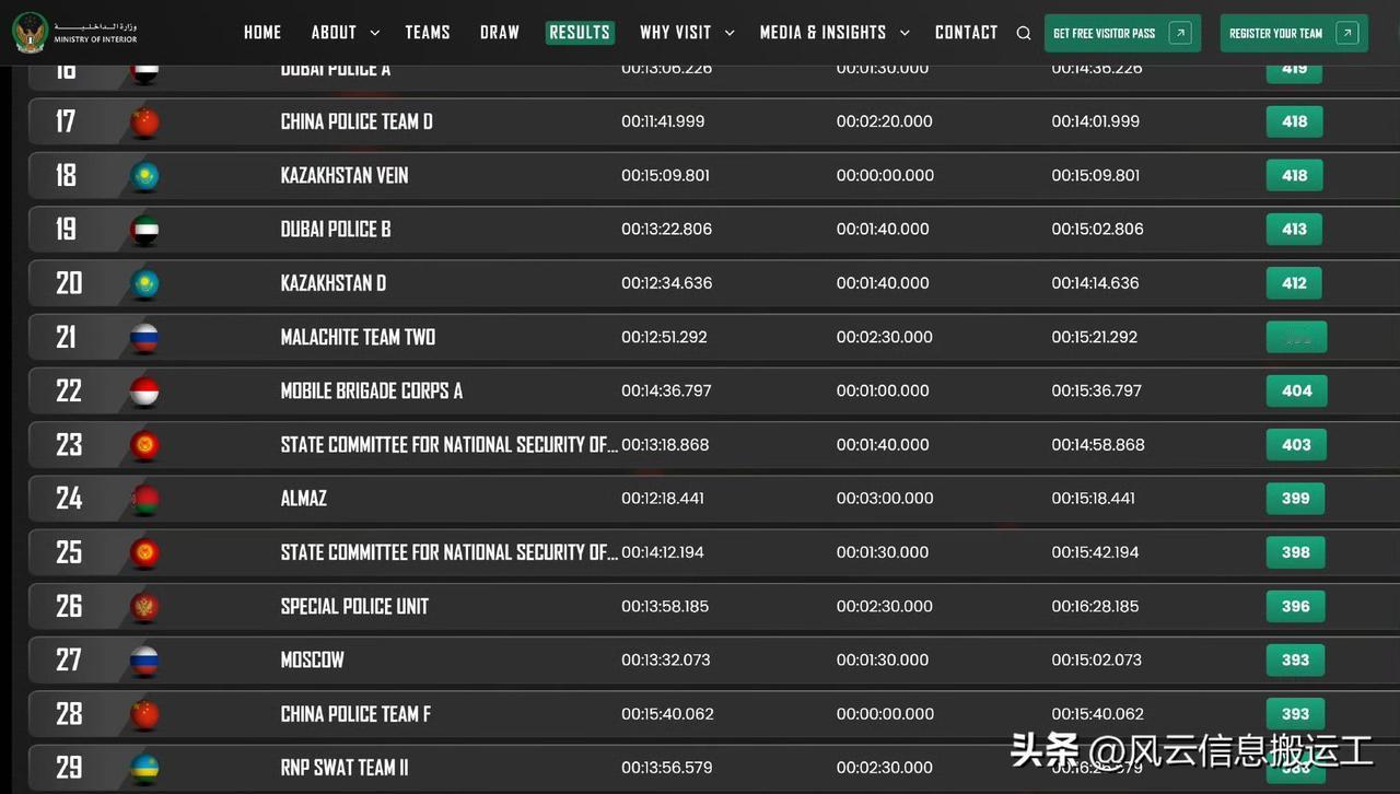 2026年阿联酋特警挑战赛最终排名: 中国 C 队(江苏):总分第三 中国 A 队(特勤):总分第四 中国 B 队(浙江):总分第十一 中国 D 队(新疆):总分第十七 中国 F 队(四川女队):总分第二十八,女队第二 中国 E 队(特勤女队):总分第三十五,女队第三