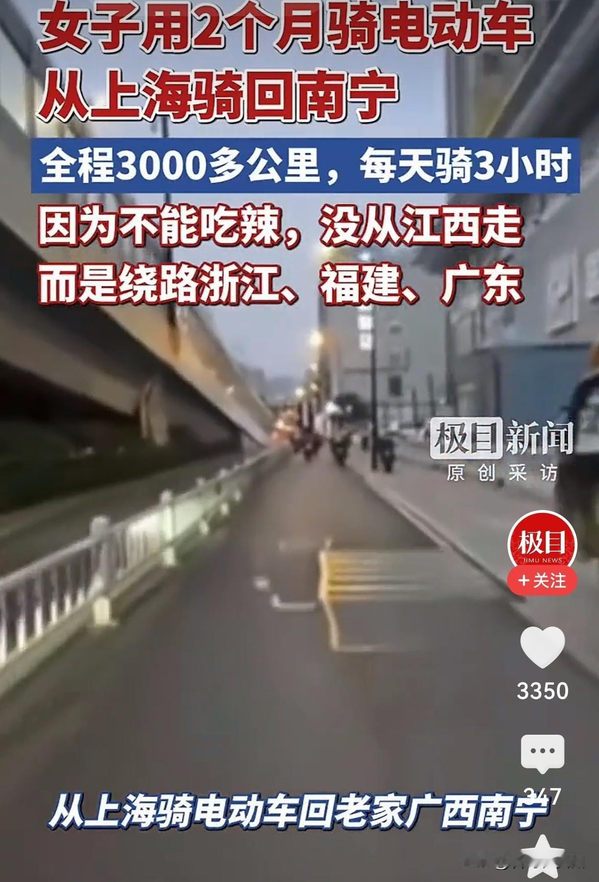 硬核女子!独骑电动车从上海回广西,3000公里走了近俩月 春节返乡名场面!一位女子独骑电动车从上海回广西南宁,3000多公里的路硬是走了近两个月!谁懂啊?这份勇气和回家的执念,真的太戳心了! 别人返乡都是高铁、飞机、自驾,她倒好,骑个电动车就出发了。上海到南宁,横跨浙江、江西、湖南、广西,整整四省一市。电动车这小身板,续航撑死一百公里,她硬是骑了三千多公里。近两个月的时间,风里雨里,就这么一步步挪回了家。 说实话,刚看到这条新闻,我第一反应是:这姑娘是不是走错片场了?三千公里,搁别人早坐高铁十几个小时到家了。她偏不。一辆小电驴,一个头盔,一个背包,独自上路。 春节回家的方式千千万,高铁最快,飞机最省事,自驾最自由。可她选了最慢的一种——也最笨的一种。但偏偏是这种笨,让人心里一暖。想想自己春节抢票的焦虑,熬夜刷12306的手速,再看她的淡定从容,突然觉得,家不在远,有心就行。 有人问:她图什么? 图省钱?三千公里电费撑死几百块,可时间成本呢?两个月不工作,吃喝住宿,加起来比高铁票贵多了。图新鲜?一个人骑车,前不着村后不着店,孤独感能把人吞了。图流量?人家全程低调,到了老家才被亲戚拍下发上网。 我想,她图的只是一件事——用自己的方式回家。 这一路肯定不容易。电动车续航有限,冬天电池掉电更快,骑几十公里就得找地方充电。遇上雨天,躲桥洞、避大雨是家常便饭。累了就在路边歇脚,饿了啃几口面包。晚上找小旅馆住,有时候前不着村,只能硬着头皮夜骑。独身女性,还得时刻警惕安全。 换作是我,别说三千公里,三十公里我都怂。她到底是怎么坚持下来的? 有网友猜:她一定在路上哭过。夜骑的时候,前路黑漆漆,后视镜里空无一人,那种孤独感,光是想想就鼻酸。也有网友说:她肯定笑过。在某个不知名的小镇,充电时遇到热心的老板娘,端来一碗热汤;在盘山公路的下坡,风从耳边呼啸而过,突然觉得自由真好。 这些未知的故事,恰恰是这趟旅程最迷人的地方。三千公里,不是冷冰冰的数字,而是一天一天的日出,一站一站的风景,一个又一个陌生人递来的善意。电动车骑得很慢,但每一米都真实,每一里都踏实。 咱们都习惯了快。 高铁提速,快递次日达,连短视频都要三秒抓不住人就划走。回家这件事,也被压缩成一张车票、几小时车程。到了家,行李一扔,手机一刷,年就过了。可这一路奔波的风景呢?途中偶遇的人呢?那些本应成为记忆的路程,都被“快”抹掉了。 这姑娘用两个月,把路走长了,却把年过厚了。 可话说回来——我们都在夸她勇敢,但换个角度想,为什么骑电动车返乡会上热搜? 因为在这个凡事求快的时代,慢成了一种奢侈品。我们不敢慢,怕落后,怕被淘汰,怕比别人少赚一分钱。可回家这件事,真的越快越好吗? 她的电动车,时速不过二三十公里,却比任何交通工具都更贴近土地。她能闻到路边油菜花的香,能看到夕阳把稻田染成金色,能感受风从热变凉、从湿变干。这些,高铁窗外的时速三百公里,根本留不住。 所以,真正戳中我们的,不是她有多勇敢,而是她敢慢下来。 我们呢?嘴上说着想回老家,身体却困在城市的格子间。不是不想回,是不敢“慢”。怕请假扣钱,怕手头工作断档,怕回家被催婚催生。于是回家的路,越来越快,也越来越淡。 这位姑娘用一辆电动车,替我们走了一次“慢回家”的路。她把我们心里那根不敢松的弦,轻轻拨了一下。 其实,每个人心里都有一条“慢路”。只是有人骑电动车走了三千公里,有人连从公司骑共享单车回家的勇气都没有。 你敢不敢也试一次?哪怕只是今年除夕,不开车、不叫车,陪家人慢慢走一段夜路。路灯下影子拉得很长,话也说得比平时多。那种慢,才是过年该有的样子。 评论区聊聊:你春节返乡最难忘的一次经历是什么?有没有哪一年,你走得特别“慢”?
