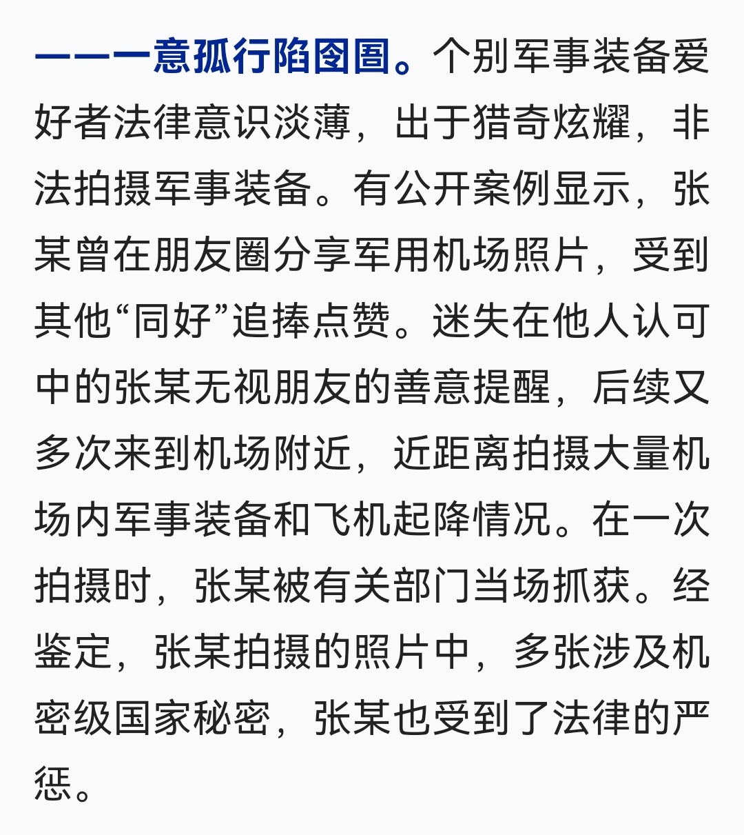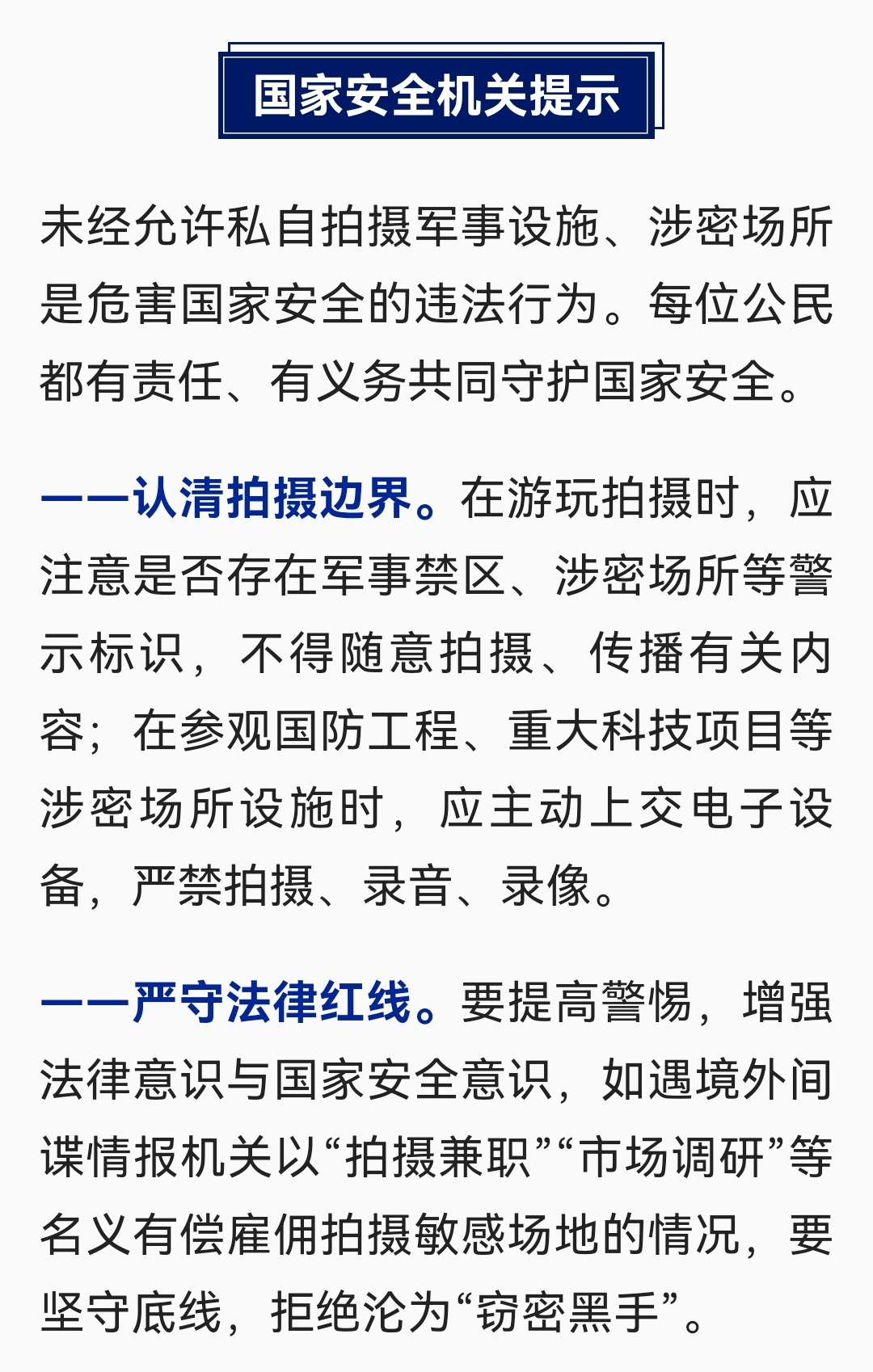 国安部提醒镜头下的泄密雷区个别军事装备爱好者法律意识淡薄,出于猎奇炫耀,非法拍摄军事装备。国家安全机关提示:未经允许私自拍摄军事设施、涉密场所是危害国家安全的违法行为。