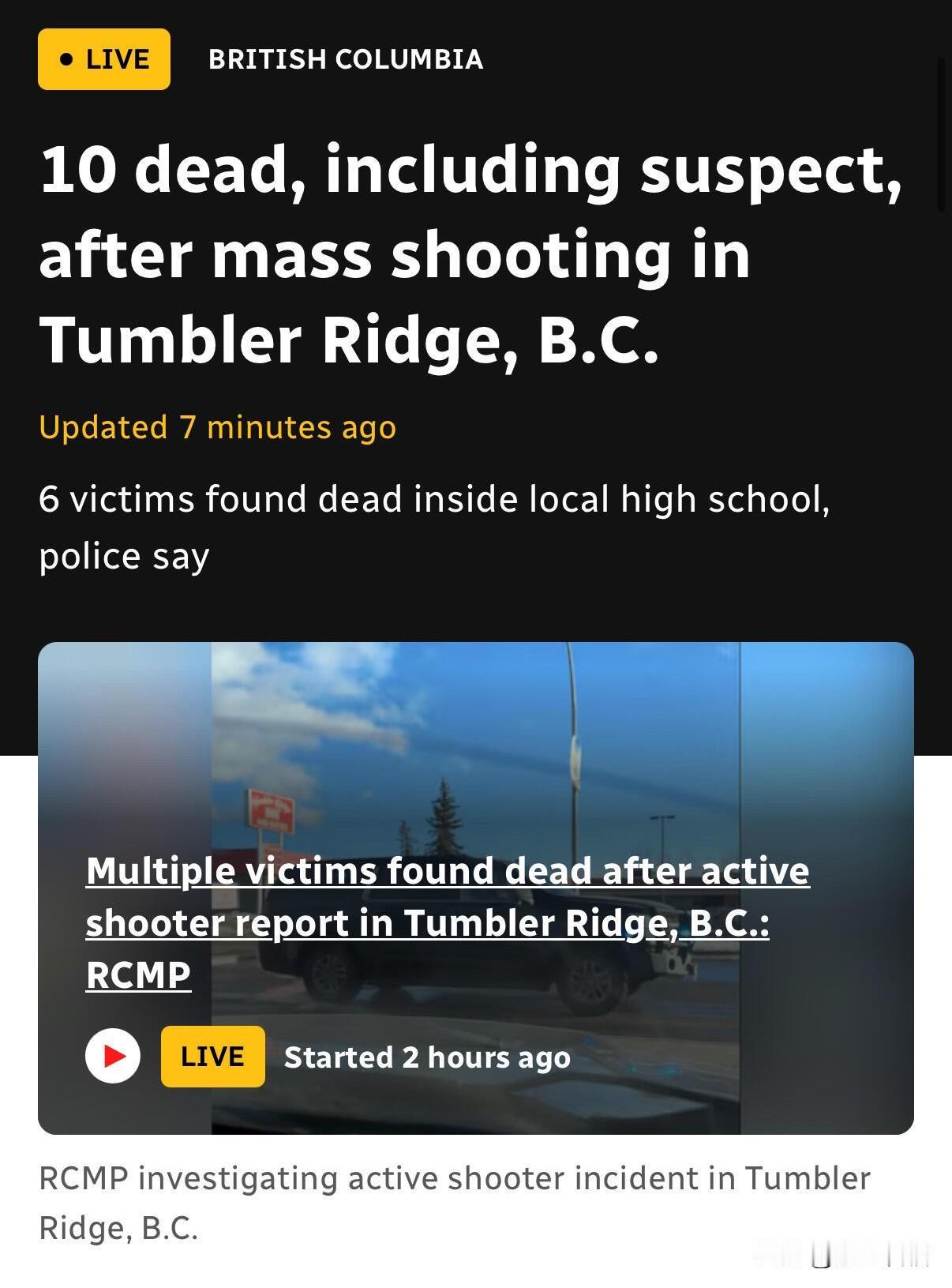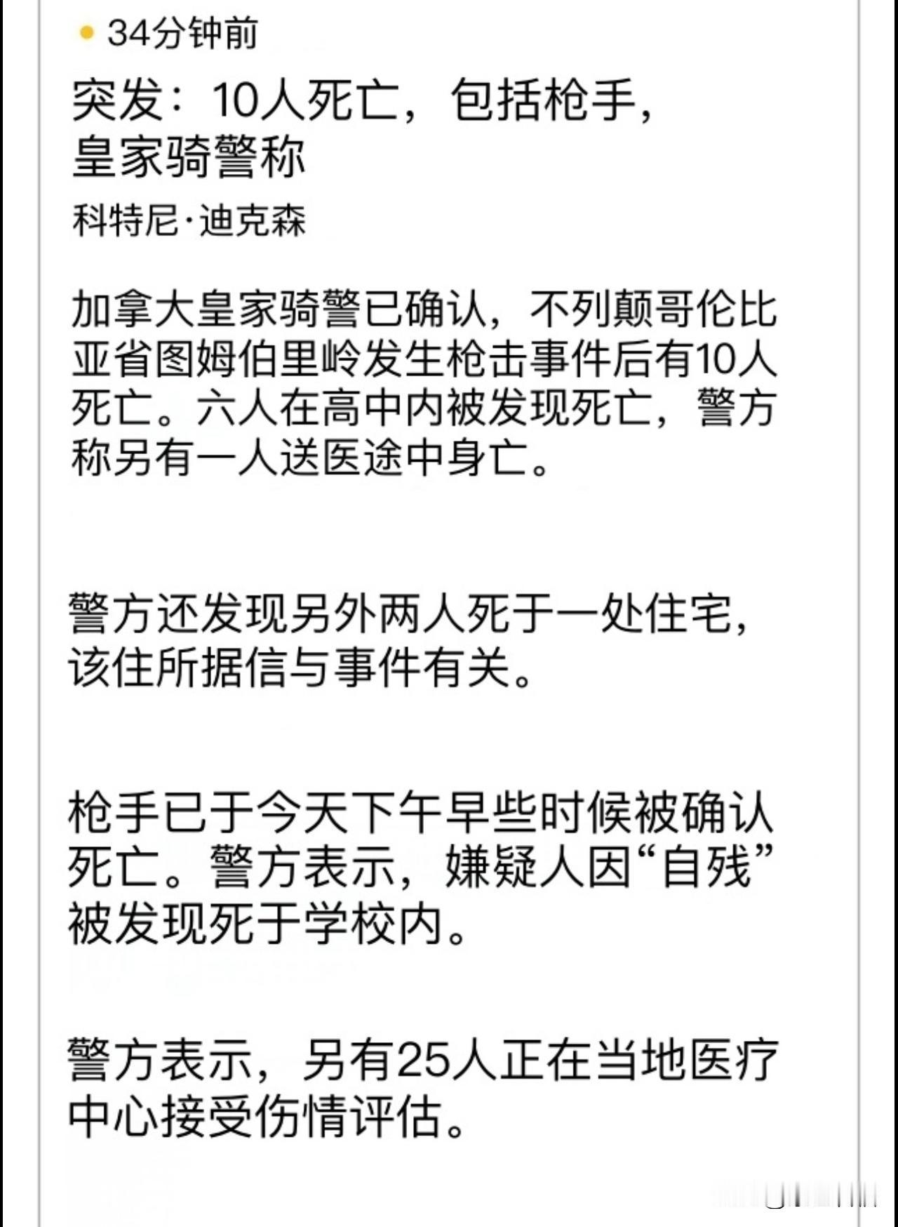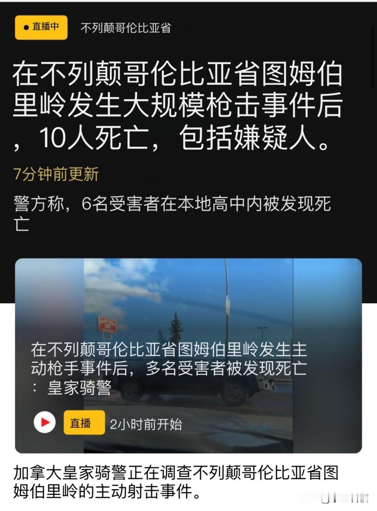 据外网消息,加拿大突发最严重校园枪击事件,造成10死25伤。 1月11日下午,事发地在加拿大北部城市 Tumbler,距离温哥华1000多公里,目前已经造成10死25伤。这是加拿大历史上最严重的校园枪击案。 据悉,凶手是一名印第安人,男性,18岁,几年前做了变性手术变成女性。此人有严重心理问题,母亲曾多次社交平台求助。 不得不说,我们中国才是世界上最安全的国家,没有之一。有人说得对,枪支在有些国家如同玩具一样普遍。 (图片来源网络)
