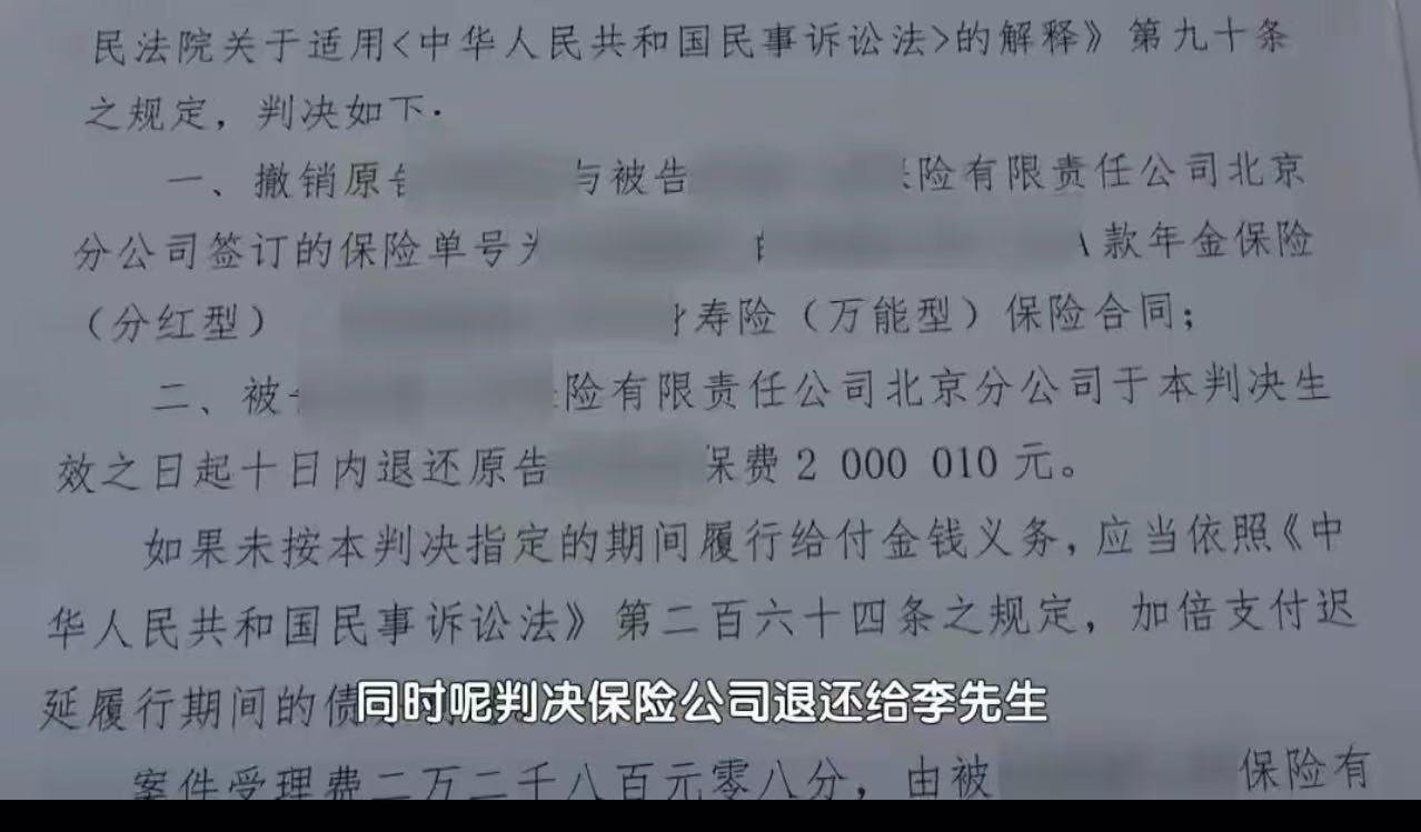 “打着保险的幌子坑人?”男子投资1000万买保险,到105岁才能取回本金,要求退保遭拒!男子:“105岁,我两代人都花不着这笔钱!”法院:保险公司构成欺诈,撤销合同! 李先生很震惊,自己辛苦打拼下来的千万积蓄,本想着买保险能安享晚年,结果仔细看合同发现需要自己105岁之后才能取回本金! 他觉得不可思议,自己能不能活到105岁暂且不说,这笔钱到底要留下来给谁花呢? 自己花不了,儿子花不了,孙子能不能花也是未知数,因为自己有没有孙子也不知道! 他觉得这样的保险产品,就是坑人…… 事情得从2024年夏天说起。李先生想着把积蓄做点稳健理财,安度晚年。此前几年,他通过某保险公司业务员陆续买了几份“灵活支取”的理财型保险,体验不错,对这位业务员也颇为信任。 6月30日,业务员打来电话推荐:“李总,有个‘终身保障+高收益’的稀缺产品,额度快抢光了!今天签,还能锁定利率!” 对方反复强调:“五年就能回本,随时可取,安全又增值。” 李先生没多想,在对方催促下,当天就签了合同,并一次性缴纳首期保费200万元(后续计划追加至1000万)。 可等他静下心来翻看那本厚达50页、密密麻麻全是小字的合同,越看越心凉—— 所谓“五年可取”,只是每年能领几千块“生存金”;真正的1000万本金,必须等到他年满105周岁才能一次性领取! 李先生气得手发抖,“这哪是保险?这是给我曾孙子存的棺材本吗?” 更让他愤怒的是,业务员当初口口声声说“短期理财”,却对“105岁才能取本金”这一核心条款只字未提,合同里还用极小字体藏在附录中。 他多次联系保险公司要求退保,对方却以“已过犹豫期”“合同自愿签署”为由拒绝。无奈之下,李先生一纸诉状将保险公司告上法庭。 法院审理后一锤定音: 业务员明知李先生需求是“五年内可支取本金”,却故意隐瞒关键条款,诱导其签订与真实意愿完全不符的合同,构成欺诈! 同时,李先生在发现后一年内起诉,未超《民法典》规定的撤销权期限。 最终,北京密云法院判决:撤销保险合同,保险公司全额退还200万元保费及利息,共计2000010元。 【网友怒批保险乱象】 “这种‘长寿险’就是文字游戏!用‘终身’‘传承’包装,实则是把钱锁死几十年,吃定你活不到那天!” “我爸妈也被忽悠买过类似产品,说‘给孩子留财富’,结果孩子40岁才能领——保险公司稳赚几十年利息,我们血亏!” 重点不是产品本身违法,而是销售过程欺诈!用‘随用随取’骗人签字,良心不会痛吗?” “别再信‘业务员推荐’!所有保险,必须自己逐字读完现金价值表和领取条件,否则就是送钱给保险公司!” 也有少数声音辩解:“合同白纸黑字,自己不看怪谁?” 我认为, 这场“105岁取款”闹剧,撕开了某些保险产品的虚伪面具—— 它们打着“养老”“传承”的温情旗号,干的却是“资金长期质押、客户大概率无法兑现”的冷血生意。 更可怕的是,利用老年人对“稳定”“保障”的渴望,用模糊话术诱导签字,把复杂金融产品包装成“存钱罐”,本质是一种合法化的掠夺。 法院的判决固然大快人心,但若没有司法介入,多少普通家庭会默默吞下这颗苦果? 当一份合同的设计前提竟是“赌你活不到领钱那天”,它早已背离了保险“互助共济”的初心,沦为一场赤裸裸的寿命对赌。 真正的保障,不该建立在客户的死亡概率之上;而消费者的觉醒,必须从“不再轻信一句‘放心,没问题’”开始。