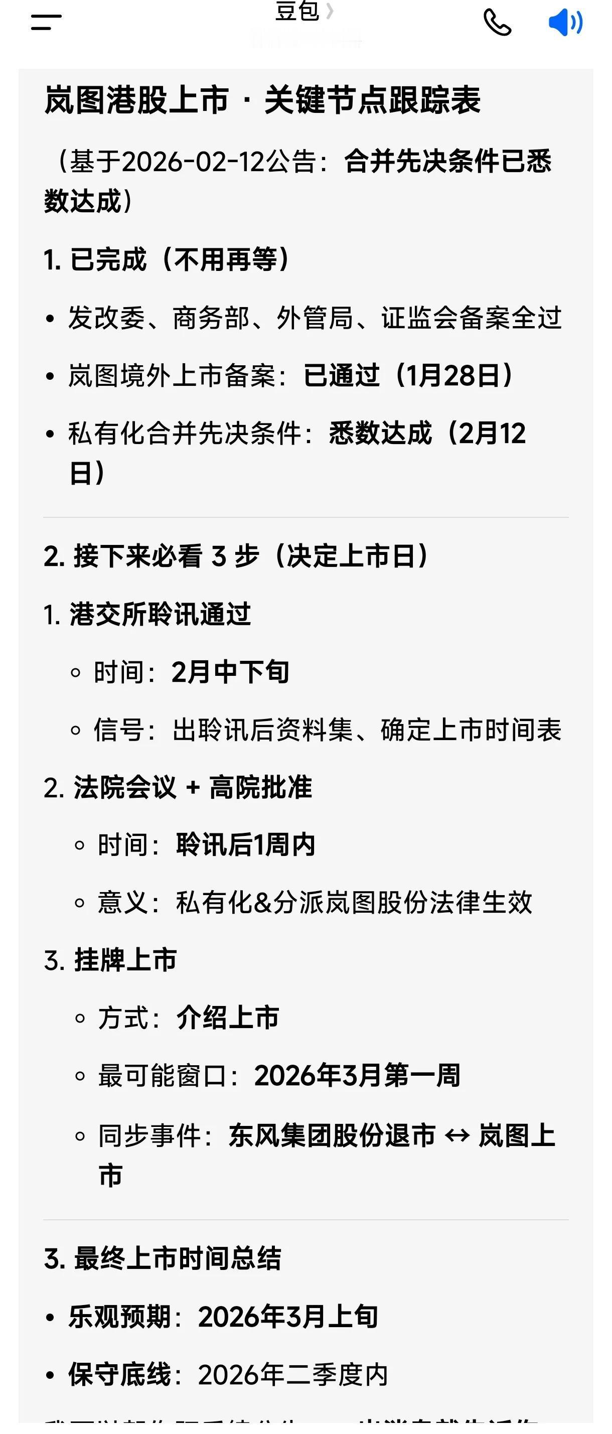 岚图何时可以在港交所上市?看看豆包AI怎么分析的! 一、核心结论(2026-02-12最新) 岚图港股上市时间:乐观估计大概率在2026年3月上旬,保守估计最晚二季度之内与东风集团股份私有化退市同步完成 。 二、当前进展(2月12日公告) - 合并先决条件悉数达成(发改委、商务部、外管局、证监会备案均已完成)。 - 岚图已获中国证监会境外上市备案(1月28日) 。 - 仅剩港交所聆讯、法院会议、高院裁定、股份注销/上市登记几步 。 三、时间线推演(最可能路径) 1. 2月中下旬:港交所聆讯通过;召开法院会议并获高院批准 。 2. 3月初:协议安排生效、东风集团股份退市、股份注销 。 3. 3月第一周:岚图以介绍方式在港交所挂牌上市 。 4. 保守窗口:2026年4–6月(监管/结算缓冲) 。 四、关键规则 - 介绍上市:不发新股、不融资,仅挂牌交易;股权来自东风集团股份实物分派(79.67%股权按比例分给原股东)。 - 母退子上:东风集团股份私有化退市 ↔ 岚图上市,同步绑定、互为前提。