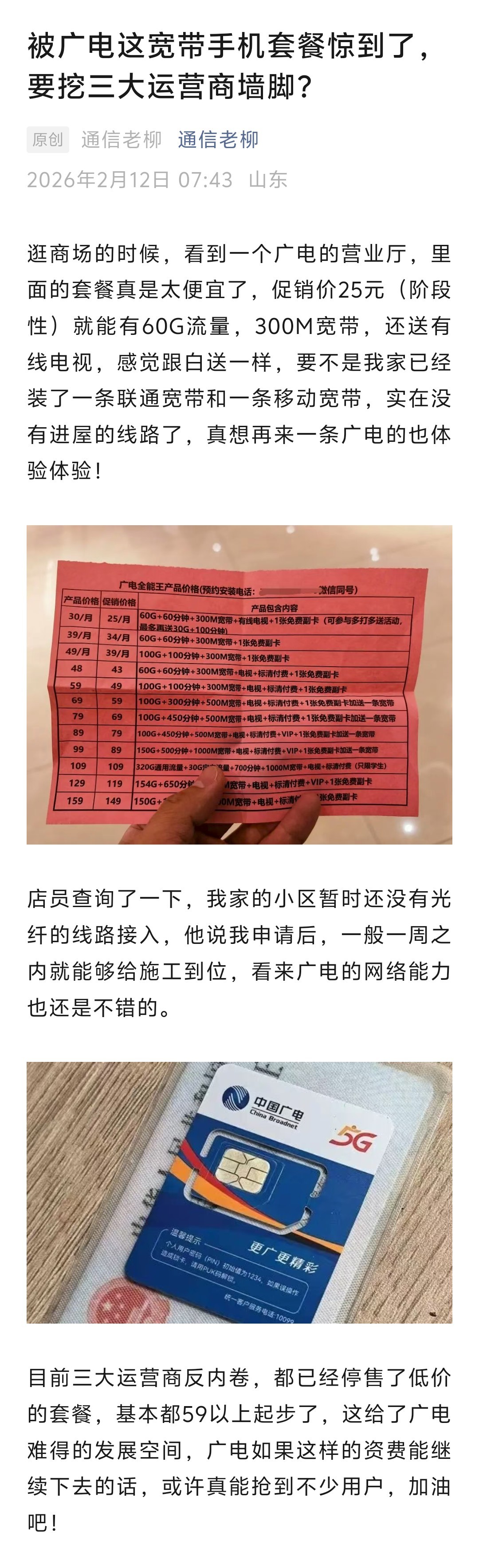 逛商场的时候,看到一个广电的营业厅,里面的套餐真是太便宜了,促销价25元(阶段性)就能有60G流量,300M宽带,还送有线电视,感觉跟白送一样!电信联通移动估计要颤抖了