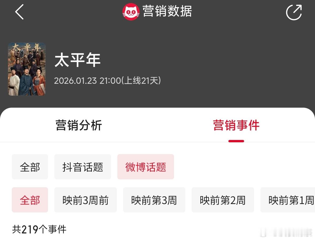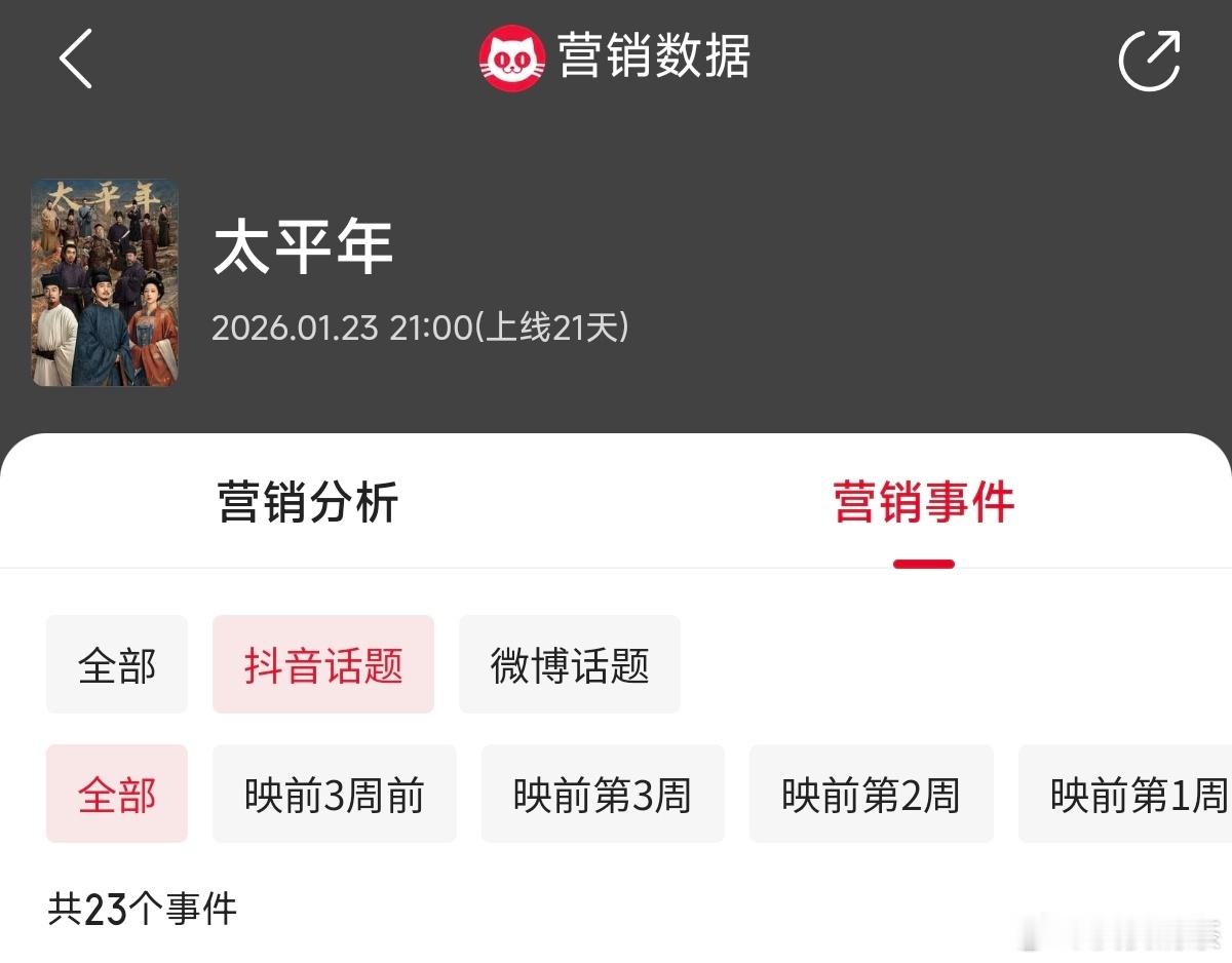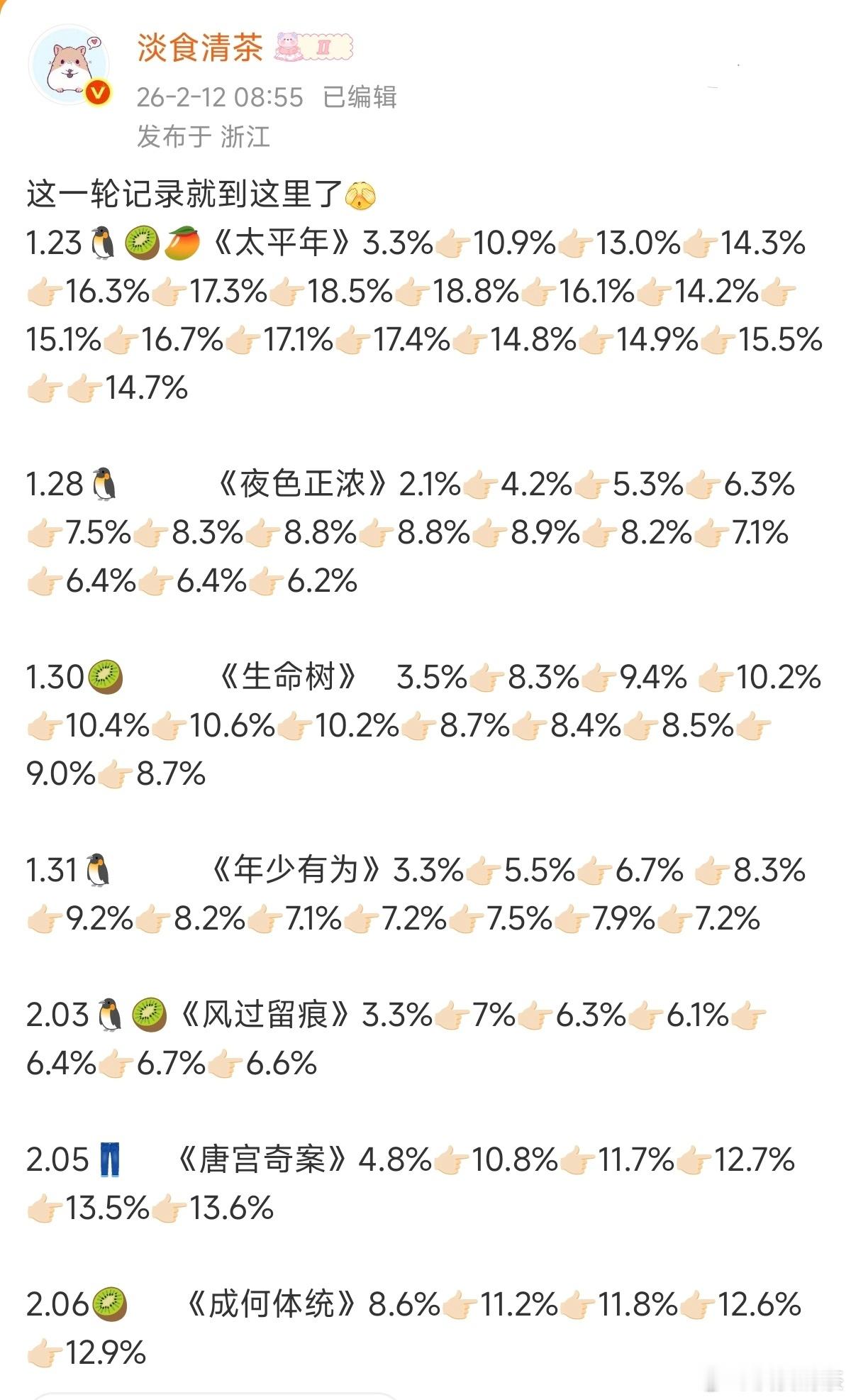 热搜情况1.23🐧🥝🥭《太平年》抖23、微2191.28🐧 《夜色正浓》抖29、微361.30🥝 《生命树》 抖100、微8271.31🐧 《年少有为》抖58、微552.03🐧🥝《风过留痕》抖9、微702.05👖 《唐宫奇案》抖78、微4882.06🥝 《成何体统》抖30、微92