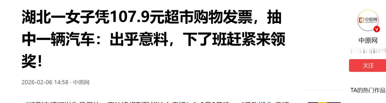 简直赚翻了!”近日,湖北武汉,一女子在超市购物,花了107.9元,结账后,便参与了抽奖活动,没想到竟抽中一辆汽车!得知中奖后,女子十分激动,同事也纷纷前来握手,都想要沾沾喜气!网友:这运气真的绝了! 事情发生在年关将至的时候,武汉的街头已经有了过年的喧嚣,家家户户都在忙着采购年货,超市里也格外热闹,人来人往到处都是烟火气,张女士和往常一样,趁着空闲时间,去家附近的超市买些油盐酱醋之类的日用品,都是些生活刚需,没想着能有什么意外惊喜。 挑选好东西后她推着购物车来到收银台结账,随着收银台打印机滋滋作响,一张热敏纸小票打印了出来,上面清晰地印着消费金额,107.9元,放在平时这点钱真的不算什么,也就够买些普通的日用品,在武汉这座城市里,算得上是最微不足道的日常开销,谁也不会把这张轻飘飘的小票放在心上,更不会想到它会在几个小时后,给张女士带来一场天大的惊喜。 张女士本来并不知道这家超市有抽奖活动,她就是个习惯在生活中“随手试一试”的人,不管是线上的红包,还是线下商家的抽奖,只要看到了总会顺手参与一下,不为别的就是想给平淡的生活找点乐子,主打一个心态松弛,也没指望能中什么大奖。 这次参与抽奖,甚至还有点被动。结账后,她正准备拿着东西离开,身边热心的同事刚好也在超市购物,随口跟她说了一句,这家超市有抽奖活动,消费满一定金额就能参与,张女士愣了一下,低头看了看手里的小票,发现107.9元的消费金额,刚好迈过了抽奖的门槛,于是就顺水推舟,在工作人员的指引下报了名,参与了这次抽奖。 那个时候张女士的心理预期,和我们平时买两块钱彩票差不多,就是重在参与图个热闹,至于特等奖,她想都没敢想,觉得那都是别人家剧本里的事,和自己没关系,毕竟这么低的消费,中大奖的概率实在太低,低到几乎可以忽略不计。 所以当超市工作人员的电话打进来,通知她中了本次抽奖活动的特等奖,奖品是一辆汽车的时候,张女士的第一反应不是狂喜,而是满满的警惕,在这个电信诈骗花样百出的年代,谁也不会相信好运会突然凭空砸到自己头上,她下意识地就觉得,这可能是个杀猪盘,是骗子设下的圈套。 她甚至在心里悄悄预演了对方接下来的套路,想着对方大概率会让她先转账,要么说是手续费,要么说是税费,只要她转了钱,就再也联系不上人了,所以在电话里,她一直半信半疑,没有立刻答应去现场,直到工作人员反复说明,没有任何隐形消费,让她亲自到现场确认,她才抱着试试看的心态,决定去活动现场看一看。 等到了活动现场,当扩音器里字正腔圆地念出她的名字,当那辆崭新的东风纳米01新能源汽车,实实在在地停在她眼前的时候,张女士心里的防线才彻底崩塌,那种不真实感,瞬间被满心的激动冲刷得干干净净,她这才相信自己不是被诈骗了,而是真的运气爆棚,中了大奖。 那种激动是发自内心的,嘴角怎么也压不下来,连说话都有些语无伦次,后来这个好消息传回了她的公司,引发的反应也格外有意思,第二天上班张女士一走进办公室,就发现自己突然成了办公室里的“人形锦鲤”。 同事们不再只是口头跟她道贺,而是纷纷围了上来主动和她握手,一个个都笑着说,想要从她身上分流一点刚刚降临的好运气,希望自己也能沾沾喜气,新的一年也能有好运气,不管是工作还是生活,都能顺顺利利,张女士也很大方笑着和大家握手,分享自己的喜悦。 而在正式提车的那天,张女士还特意给这场惊喜,增添了满满的仪式感,她没有穿平时上班的常服,而是特意换上了一套红色的汉服,在武汉冬日的街头,这抹鲜艳的红色显得格外扎眼,也格外喜庆,提车全程她的嘴角就没有放下来过,那种溢出屏幕的喜气,比任何官方宣传都更有感染力,路过的人看到了,都忍不住为她开心。 其实生活有时候就是这样,它总在你不抱任何希望、平平淡淡的日子里,冷不丁地给你塞一颗糖,告诉你,再普通的日常,再微不足道的小事,里面都可能藏着翻盘的彩蛋,都可能藏着意想不到的好运。