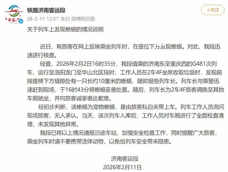 “我吓得心跳都快停了!”一女子坐高铁,座位下方突然钻出一只蜥蜴,还朝她直吐舌头,这场景够惊悚的,铁路济南客运段回应来了! 说实话,蜥蜴这种变温动物我也害怕,虽然它们不急了眼,基本不会咬人,但是看着就让人膈应。 想一想,你好好地坐在高铁上,突然跟前钻出这么一玩意儿,确实够吓人的。 这趟列车当值的是济南客运段,这不,官方回应了,说这只蜥蜴是旅客私自带上车的,已经妥善处置,列车入库后,又进行了检查,就这么一只。 网友们就问了,上高铁不是安检吗?10厘米长的一只蜥蜴,怎么就能带进去呢? 我查了一下,高铁是不能随身携带活体动物的,除非是有证的导盲犬,如果是家养的宠物,也只有猫和狗可以托运,而且身高体重还有要求,而蜥蜴之类的异宠,连托运也是不允许的。 如果有人私自夹带活体动物上高铁,被发现后,是不许进站上车的;如果已经上车,并且动物逃逸,吓到人或者造成恐慌的,就要对携带者进行处罚了。难怪,这只蜥蜴的主人,高低不敢承认,估计是知道轻重,怕被处罚。 这件事情,让大家对高铁的安检产生质疑,这次能带上车一只蜥蜴,下次就能带一条蛇,后果不堪设想。 不过也有喜欢蜥蜴的网友,他们认为没有什么大惊小怪的,这种小动物不吓人还挺可爱,如果是自己遇到,立马悄悄地揣兜里。 萝卜白菜,各有所爱,但是规则就是规则,喜欢蜥蜴,可以自己在家养,但不能带到高铁上。估计这件事之后,高铁的安检要加强了。