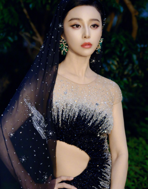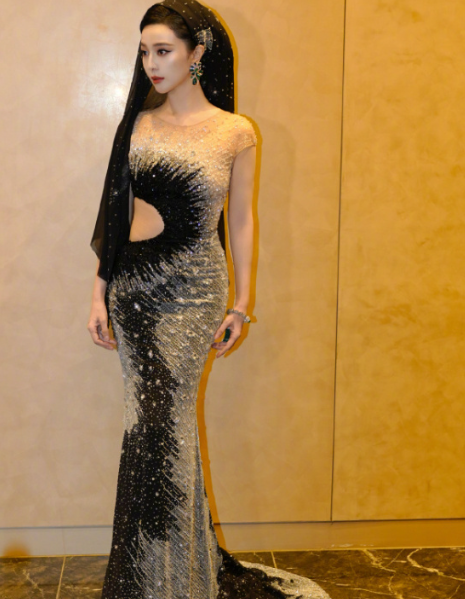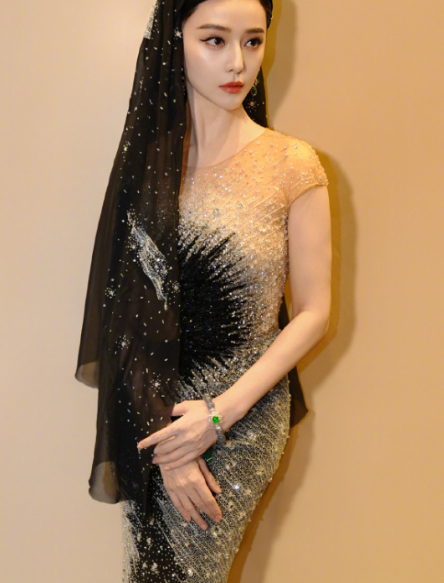 她身着一袭修身礼服,整体以渐变色彩呈现,自上而下的色调过渡自然且富有层次感