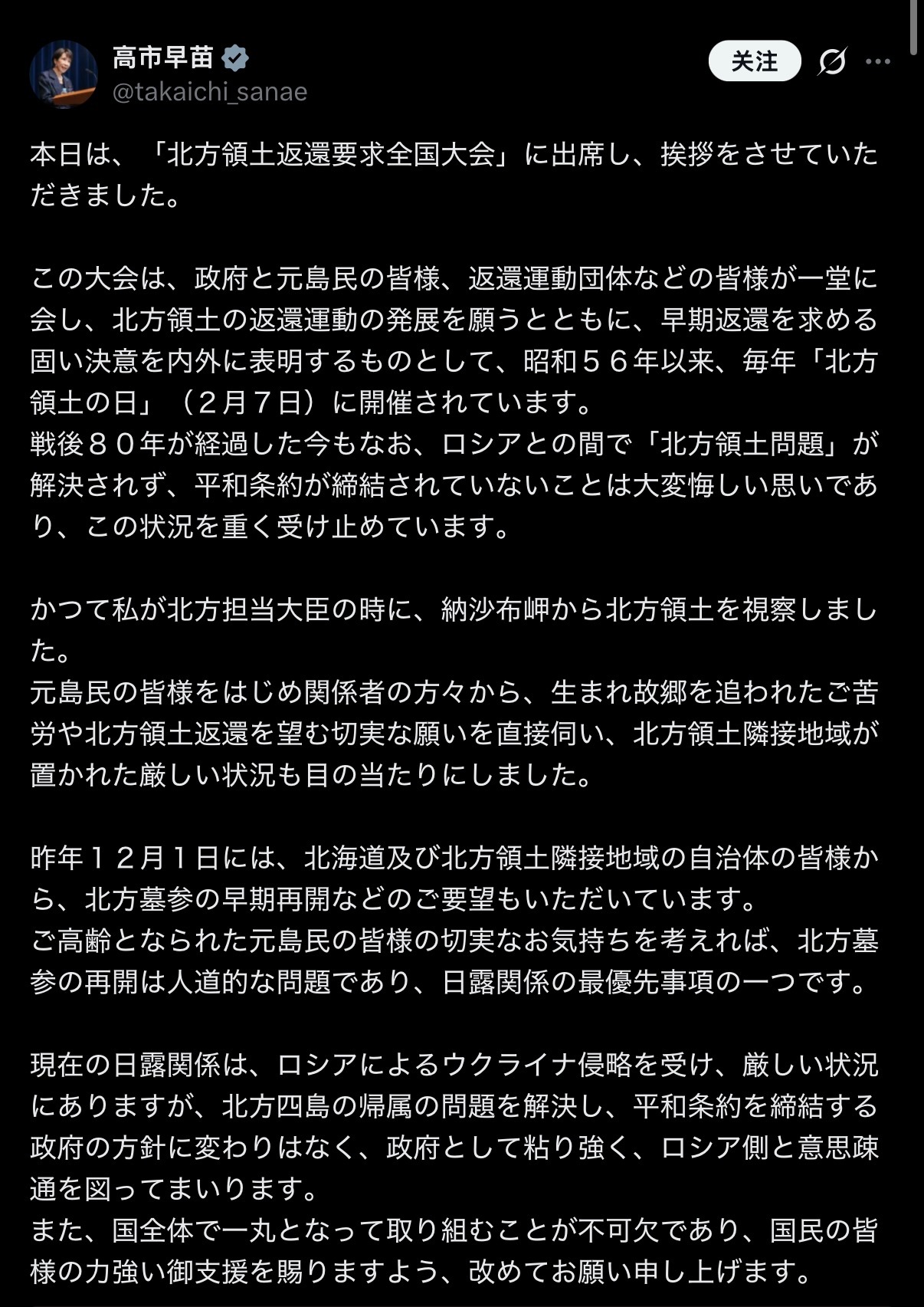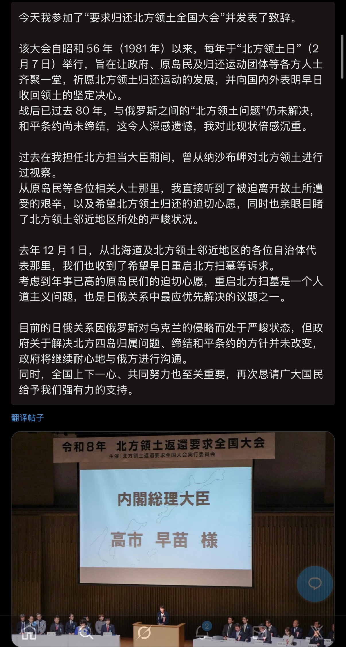 🔻高市早苗的意思是:俄乌开打以后,日俄关系比较紧张,希望俄国人把北方四岛给日本,再跟日本签一个和平条约,这样就给俄国人一个面子,“再次恳请广大日本国民给予我们强有力的支持。”🔻🔻很有精神!高市早苗赌赢后彻底不装了海外新鲜事热点现场