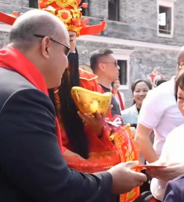 “财神爷”手拿金元宝陪同瑙鲁总统发红包成全场亮点;2月11日阿迪昂总统到江门过小年,脖子里围着中国红围巾十分喜庆,手里拿着红包派发红包很是开心,让人没想到的是陪同总统先生的“财神爷”成全场亮点。 这个“财神爷”手里拿着金灿灿的金元宝,手里还提着一个篮子,篮子里应该装着给乡亲派发的红包,站在瑙鲁总统旁边简直不要太抢镜了呀! 关于“财神爷”代表着金钱与财富,人人都喜欢财神爷,甚至过年时家里对联都贴着财神画,这也是过年的习俗,然而瑙鲁总统与“财神爷”同框毫无违和感!
