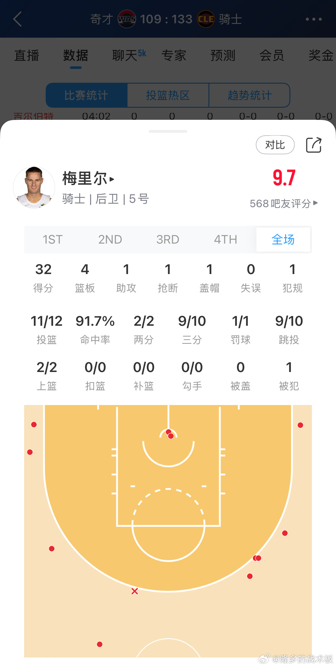 恐怖命中率!梅里尔本场三分10投9中轰下32分,提前下班