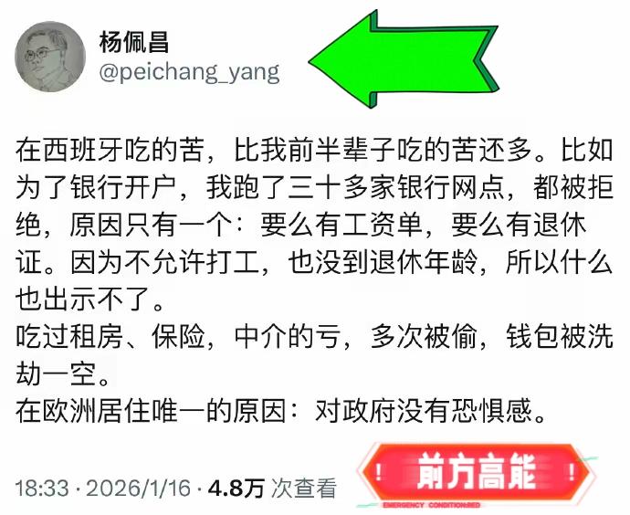 吹了一辈子的欧洲和自由,润到西班牙的杨佩昌,终于说实话了:在西班牙吃的苦,比我前半辈子吃得还多! 理想很丰满、现实很骨感。在没出去之前,听到润人和高华都在吹,吹欧洲的高薪,吹欧洲的法制和“公正”,吹那里的自由…… 结果一落地,却发现哪儿哪儿都是坑:中介和保险盯着他的钱包,文明地骗;小偷盯着他的钱包,暗度陈仓地偷;就连银行对他都各种明目张胆的为难…… 就这样,人家还嘴硬呢:虽然有那么多苦难,但是还有一点好,没有恐惧感! 这,真有点吃翔太多把智商给缀住的感觉呢?要不然,想当初这种智商如何在北大毕业的呢?还有,他到底做了什么十恶不赦的事情才会这么心虚呢? 只能说,他的认知配得上他的苦难啊~我们虽然不理解,但是还是会尊重他这种自虐的精神。 真以为润去欧洲就高人一等?现实狠狠打脸,日子过得一地鸡毛,还得硬撑着说“没恐惧”。说到底,不过是被公知滤镜骗惨了,自己选的路,哭着也得走完。认知决定命运,他今天受的苦,全是当年脑子进的水,半点不冤!