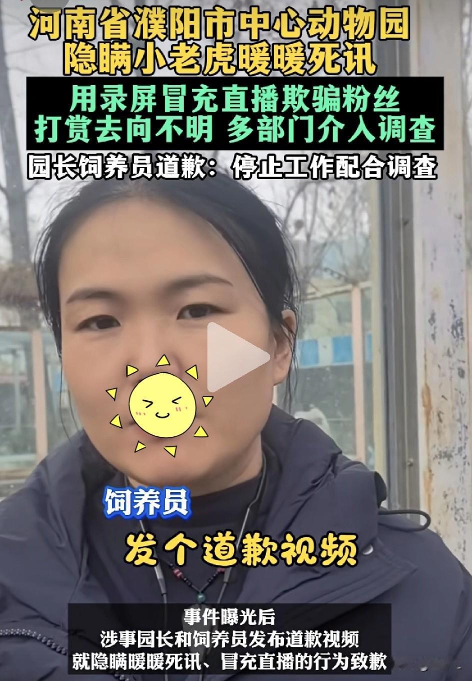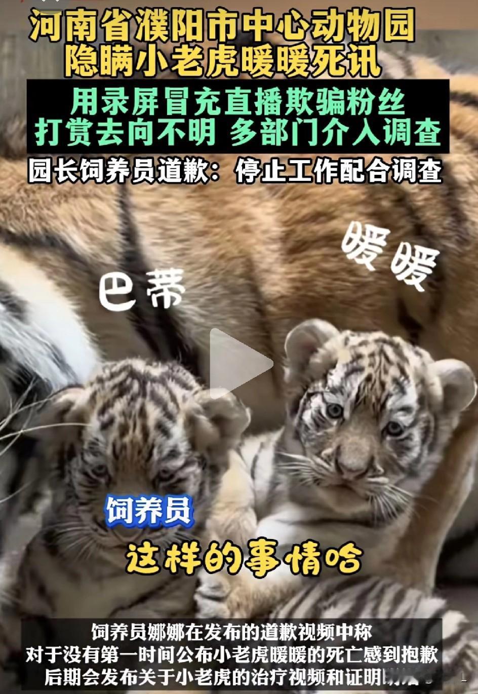 流量担当,小老虎“暖暖”没了,园长还在用录屏骗打赏?!濮阳动物园这回彻底栽了! 太气人了! 很多网友“云投喂”的小老虎“暖暖”,其实早在1月就因为猫瘟去世了。可园方呢?一边瞒着死讯,一边拿以前的录屏冒充直播,继续收粉丝的打赏、收微信转账。 钱去哪了?没人知道。 更离谱的是,饲养员“娜娜”还是直播间的流量担当,一边骗,一边收钱,直到被媒体捅破。 2月11日,官方通报来了:情况属实,动物园停业整改,园长停职,饲养员公开道歉。 网友炸锅:“暖暖没了,良心也没了?” 说是民营动物园,经营难、缺钱,靠直播吸粉改善动物伙食——可这就能骗吗?信任这东西,喂得饱一次,喂不饱第二次。 目前多部门已介入调查,钱去哪了,得一笔一笔说清楚。 暖暖走了,别让公道也走了。 素材来源:大风新闻、新京报,侵联删!
