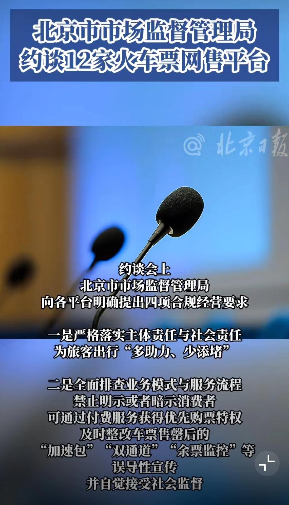 大快人心!12家抢票平台被集体约谈,加速包套路终于要凉了! 过年回家抢票,谁没被第三方平台的“加速包”“VIP抢票”坑过?点一下就扣费,不买就弹窗劝退,花了几十上百元,最后还是抢不到票,纯纯交智商税! 刚刚官宣:北京市监局出手,一次性约谈携程、去哪儿、飞猪、同程、美团、高铁管家等12家主流火车票平台,直指抢票乱象、误导宣传、强制搭售等问题,明确禁止“付费优先抢票”套路! 很多人不知道,平台吹上天的“光速抢票”“双通道”,本质就是12306免费候补,人家官方早就说过:所有第三方加速包,都不能插队、不能提速,只是把免费功能包装成收费项目,收割我们的回家焦虑! 这次监管动真格,就是要整治“抢票割韭菜”,让大家买票明明白白,不用再被套路、不用多花冤枉钱,春运回家路更顺畅更安心! 支持严查的请点赞!你买过抢票加速包吗?有没有被乱扣费、强搭售的经历?评论区聊聊,提醒更多人避坑! 北京市监局约谈12家火车票网售平台 春运抢票避坑 加速包是智商税