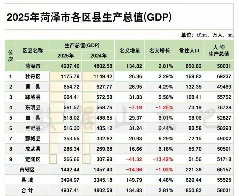 菏泽各区县2025年GDP全出炉:牡丹区位居榜首、曹县领先郓城县 菏泽2025年GDP实现4937.4亿,较2024年增加了134.82亿,名义增长2.81%,菏泽2025年常住人口为850.82万人,人均GDP实现58031元,从各区县2025年GDP数据来看,东明县和定陶区为负增长,其余各区县都实现了增长。 作为全市经济领头羊,牡丹区经济总量稳居榜首,实现1175.78亿,较2024年增加了26.36亿。 曹县和郓城县2025年GDP总量都超过六百亿,分别实现654.72亿和604.41亿,较2024年分别增加了26.95亿和31.83亿,曹县经济增量低于郓城县,对郓城县的经济领先优势缩小至50.31亿。 成武县和定陶区分别实现286.34亿和266.66亿,较2024年分别增加了16.66亿和-41.32亿,由于定陶区较去年为负增长,导致经济总量被成武县反超19.68亿。
