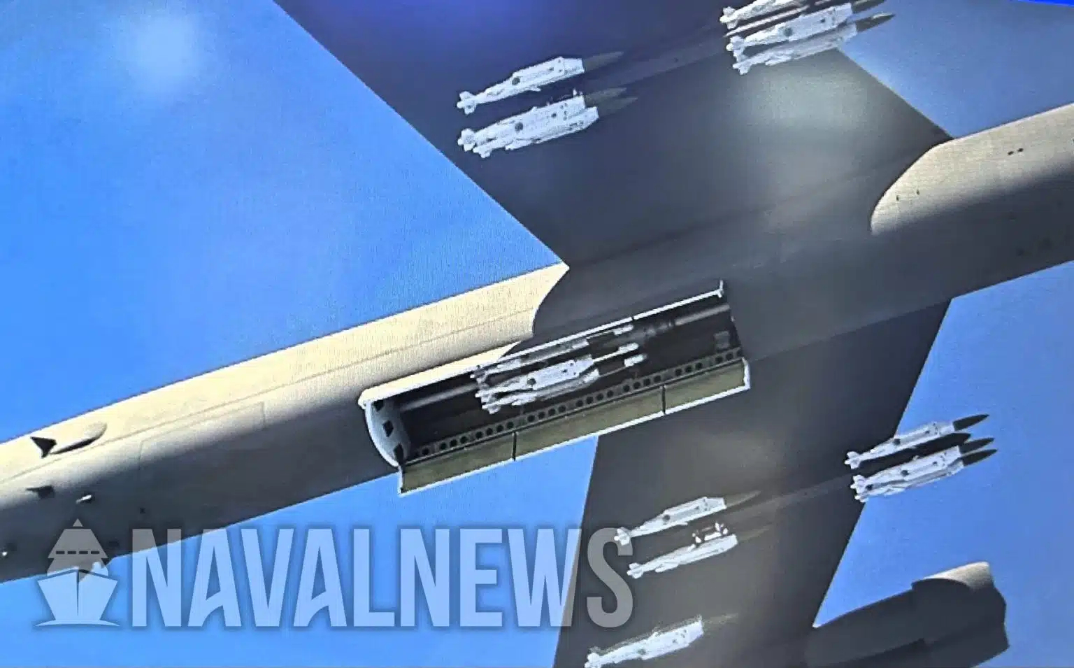 尽管远程型JDAM的具体规格、射程及型号与此前公布一致,但波音公司首次披露了美国战略轰炸机可挂载的反舰与布雷弹药大规模载荷配置。展示该系统在旧平台集成情况的视频显示,B-52可部署最多20枚远程型JDAM,其中8枚通过内置的常规旋转发射架挂载,12枚挂载于外部挂架。B-1的概念图显示,该机可通过三套常规旋转发射器及外部挂架携带最多30枚弹药。这些载荷配置与AGM-86、AGM-158联合防区外空地导弹等大型空射巡航导弹相似。