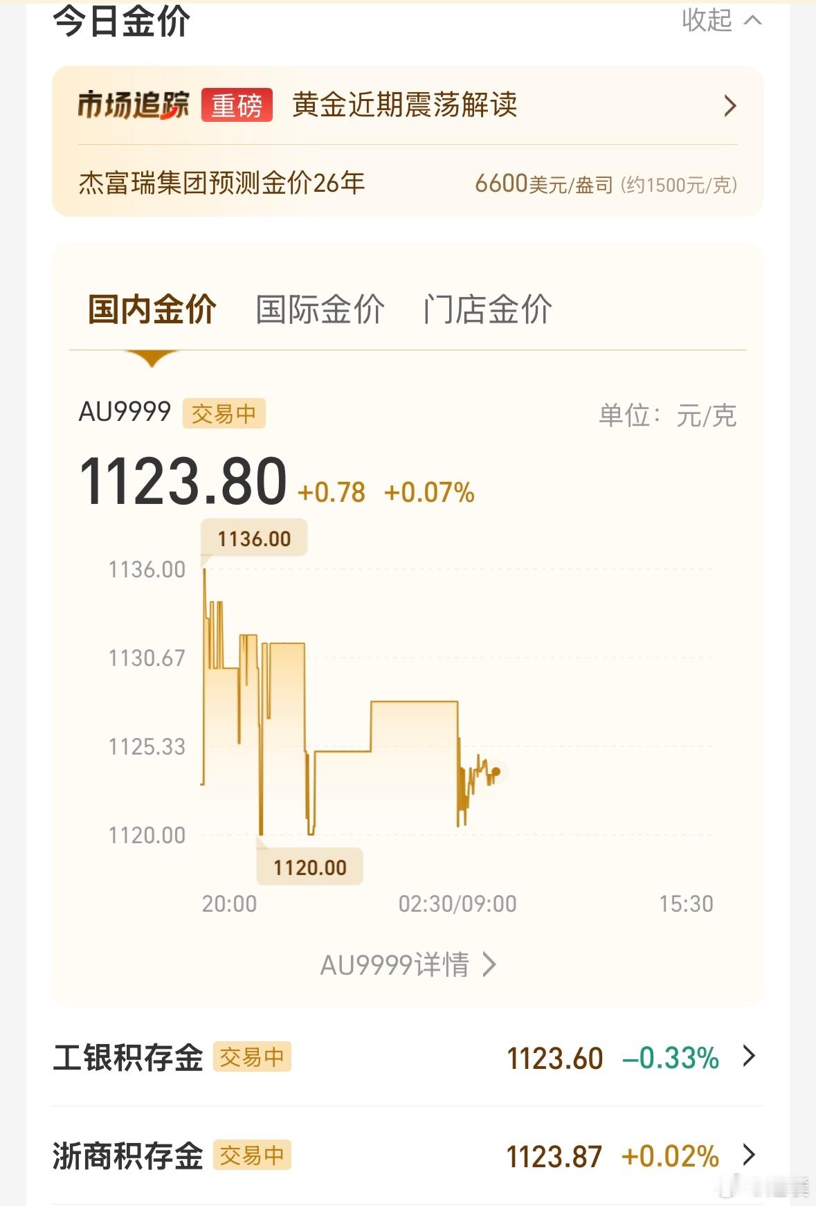 报一下实时金价,国内现货每克1123元,国际每盎司5062美元,金饰价格最高每克1560元。