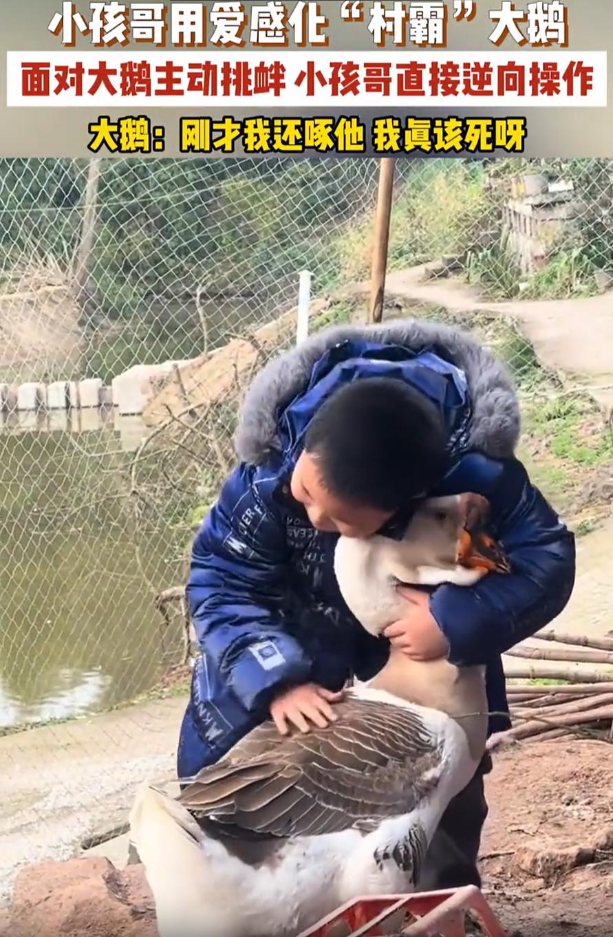 笑不活了!重庆,男孩回村里过年,看到大鹅就忍不住上去逗了一下,却被大鹅主动挑衅,还叼了两口,可小孩哥不但没生气,反而逆向操作用爱把大鹅给感化了,网友:大鹅都能感化,而我老婆不能 视频里,男孩穿着羽绒服去抱大鹅,但大鹅显然不是小狗那么温顺,看到有陌生人靠近,就主动挑衅啄了男孩两口,换成一般小孩可能就赶紧往后跑了 可这位小孩哥却一把将大鹅的脖子抱在怀里,一边抚摸着大鹅,一边用脸贴着大鹅的脖子,万万没想到,这一招还真的好用,原本暴躁的大鹅一下就温顺起来,就这么站着让男孩抱着 有网友调侃说:大鹅也是吃软不吃硬,整这出一下把大鹅都给弄不会了 还有网友说:之前看天鹅的纪录片,两只天鹅互相蹭脖子,梳理羽毛是表示亲热的意思,对天鹅来说很亲密的动作。天鹅和大鹅都是鹅,在大鹅这里应该也差不多的意思吧,这只大鹅估计在想“他好爱我” 其实,这件事挺有意思的,人与动物的互动中,很多时候我们习惯了用强硬的方式去“驯服”它们,而忽略了柔和的方式。就像这只大鹅,如果不是用爱心去化解它的怒气,可能依然会乱啄人。可小男孩的“逆向操作”给了它温暖,也让它自己慢慢放下了戒备 这一招对大鹅管用,对人其实也管用。只是成年人抱着抱着,容易想太多。想着他值不值得,想着下次会不会还这样,想着我先抱了是不是就输了