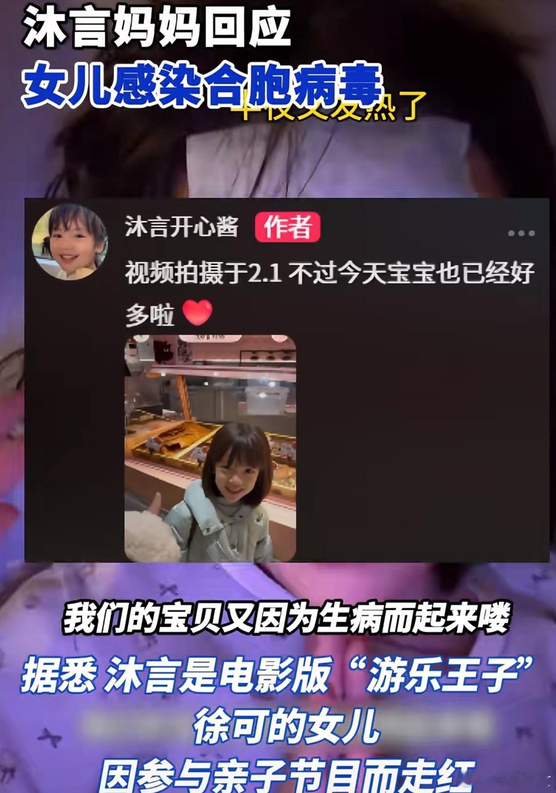 游乐王子的女儿感染合胞病毒听说游乐王子女儿中招合胞病毒了,小沐言才7岁,好在现在已经好转。孩子难受,当妈的心碎,能理解。