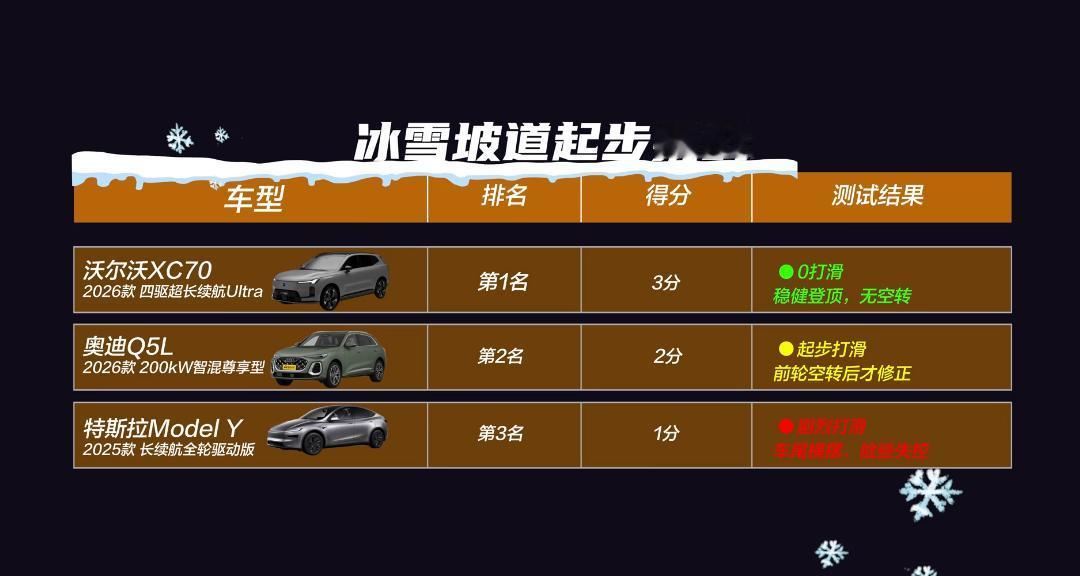 实战见真章!沃尔沃XC70、奥迪Q5L、特斯拉Model Y冬测,谁跑起来更稳? 最近有媒体对沃尔沃XC70、奥迪Q5L、特斯拉Model Y三台车进行了冬测,测试地点选在了零下20℃的松花江畔,测试车型也很有意思,三款车型分别对应时下主流的三种能源形式。而且三款车型都是偏高端的产品,所以这次测试,也是围绕“全面豪华”的主题展开。 测试内容包括低温冷启动、装载能力、座椅舒适性、自动泊车挑战等等,而在这些项目中,沃尔沃XC70属于表现相对更好的选手,不仅启动快,寒冷天气下,车内升温也快,包括自动泊车也能顺利完成。 而我个人更关注的,其实是冰雪坡道起步挑战,毕竟北方的朋友,可能经常会面临类似的情况。而在该测试中,沃尔沃XC70表现最好,没有打滑,就稳健登顶。奥迪Q5L前轮打滑,空转后才修正,特斯拉Model Y打滑就比较严重了,而且车尾发生横摆。 沃尔沃XC70之所以表现如此出色,主要还是因为四驱四擎的驱动系统,四驱很好理解,四擎代表的分别是混动专用发动机、P1、P2、P4电机,在雨雪天气下,可以自动激活四驱。而且前后桥扭矩,可以实现毫秒级分配,响应速度非常快,一旦轮胎打滑,就可以迅速分配动力,所以整车才没有出现打滑。 全时待命,是沃尔沃XC70这套四驱四擎的驱动系统的精髓,也是豪华车所带来的价值,在驾驶过程中,这套系统时刻为驾驶稳定性兜底。大家感兴趣的话,不妨深入了解一下。【来自懂车帝车友圈】