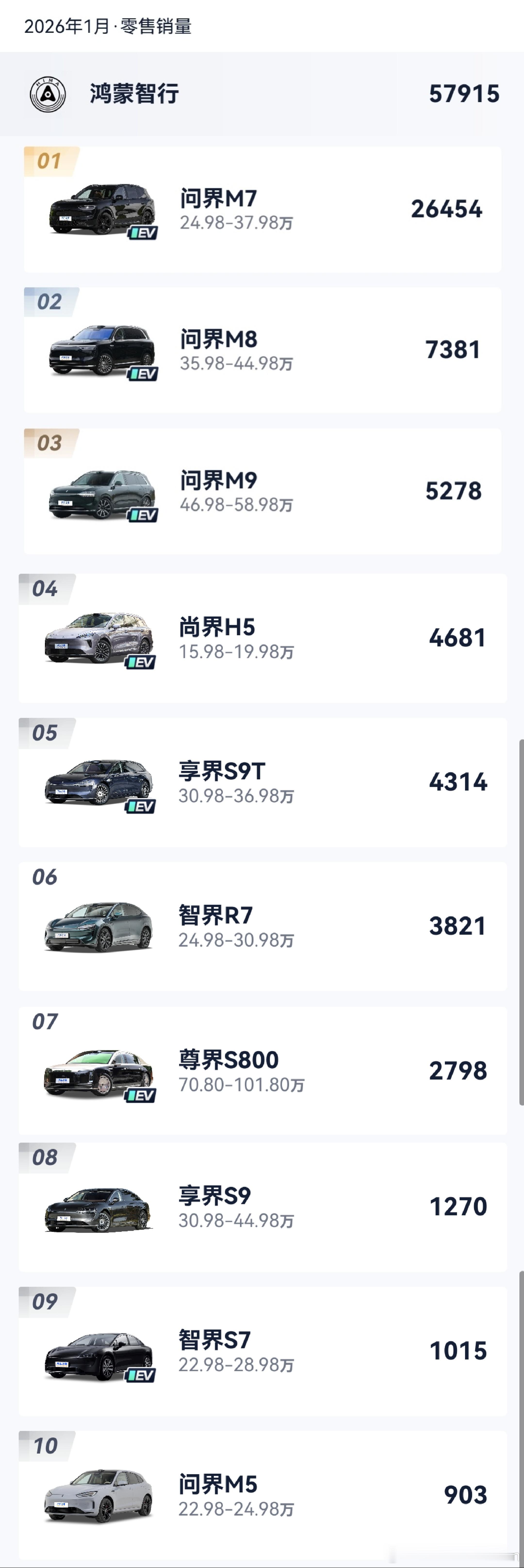 1月份的鸿蒙智行 详细数据1.问界M7 264542.问界M8 73813.问界M9 52784.尚界H5 46815.享界S9T 43146.智界R7 38217.尊界S800 27988.享界S9 12709.智界S7 101510问界M5 903
