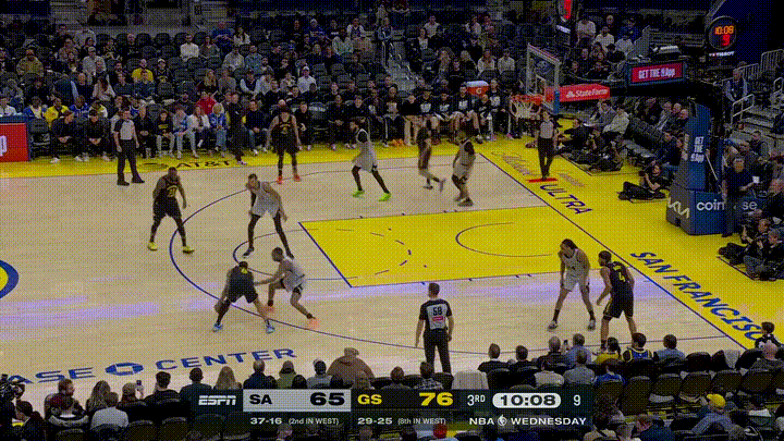 勇士老将追梦格林真是太机灵了!在今天勇士主场迎战马刺的比赛中,追梦格林好好的给文班亚马上了一课。当时比赛进行到了第三节的十分多钟,追梦格林在篮下接到队友梅尔顿的传球后,非常机灵的躲过了文班亚马的封盖,随后追梦格林靠着文班亚马的身体将球打进,还造成了文班亚马的犯规。 老实说,追梦格林在这次进攻回合中展现出了自己的智慧,他不仅戏耍了文班亚马,还造成了对手的犯规。