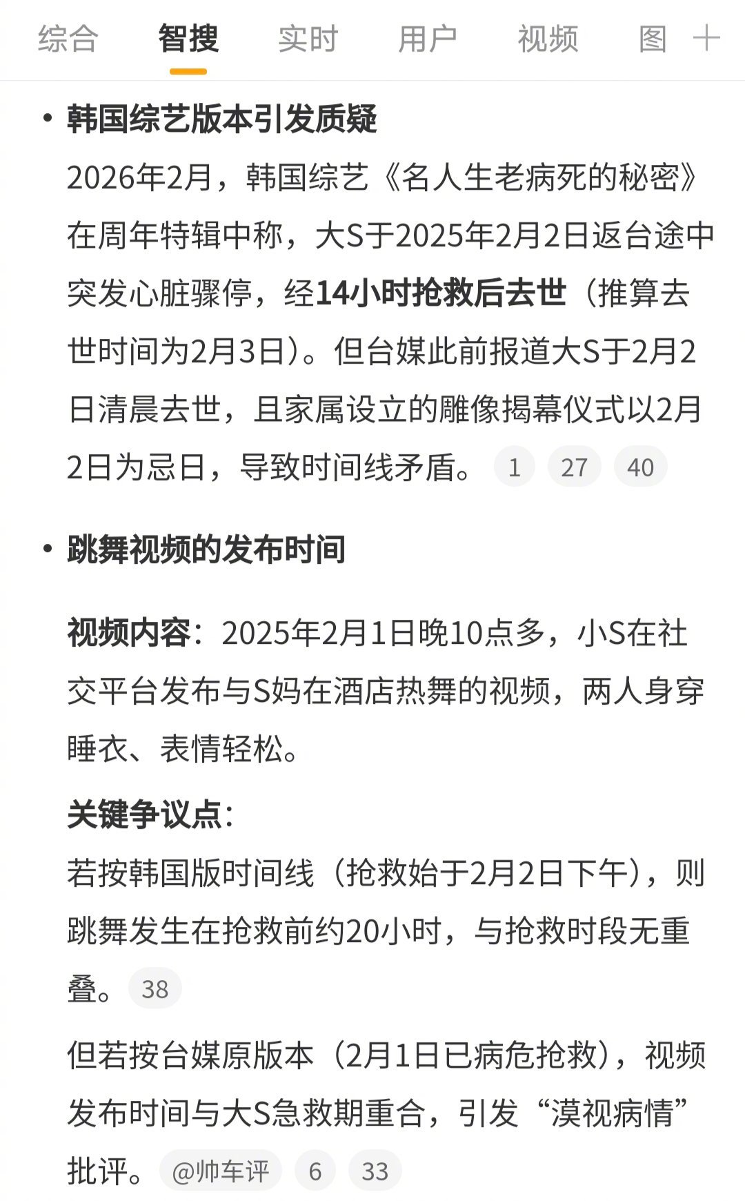 如果大S是2月1日下午开始抢救14小时,那么,S妈和汪小菲2月2日上午说大S去世能对得上,但是,2月1日晚上,小S和S妈在开心跳舞,这个时候大S在抢救,这个问题就很难解释清楚了。