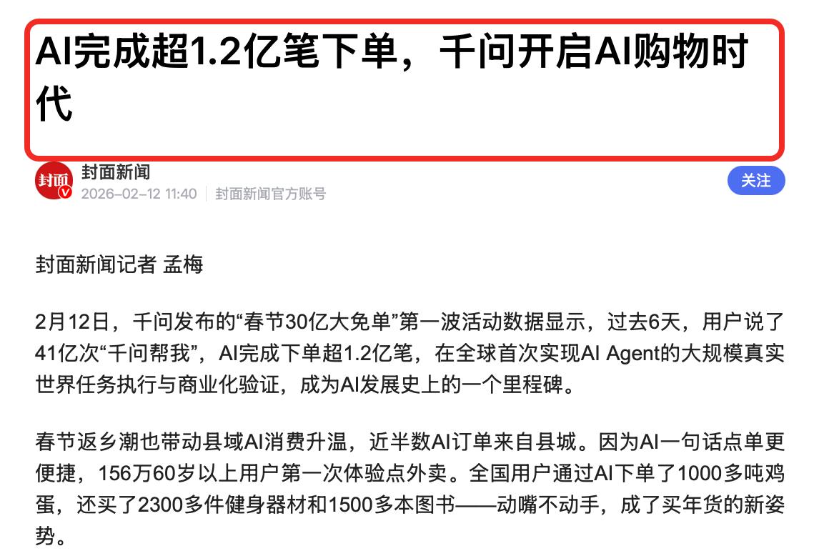 精彩!今年春节必定不寻常,千问释放的信号很明显! 2月6日,千问30亿春节请客计划第一轮上线,请大家免费喝奶茶,当时朋友圈奔走相告,不少人都通过千问体验到了第一次点外卖,真正感受到了科技带来的便利。 知道千问很火,增长很快。不过说实话,没想到能有这么快。 2月12日的新闻显示,过去6天的时间,千问的AI订单量已经突破1.2亿单,并且,这6天时间内,广大用户对千问说了41亿次“千问帮我”! 通过这组数据,能明显反映出两个事实。 第一:千问带来的AI消费新形式,赢得了广大用户的认可,因此大家积极让千问帮我。 第二:千问对现实生活确实有积极的作用,能真正帮助到大家,所以在6天的时间里,千问呈现出了一个增长的态势。 通过千问在春节前取得的成绩,能明显感受到,千问在这个春节的竞争力会非常强,而在整个春节期间,千问必定还会持续发力,到时候AI这场大战一定会更加精彩。