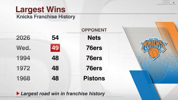 NBA常规赛,尼克斯138-89大胜76人。 本场比赛,尼克斯49分大胜76人,创造队史单场第二大赢球分差。 据统计,尼克斯队史最大赢球分差分别是: 2026年1月 尼克斯大胜篮网54分 今日 尼克斯大胜76人49分 1994年 尼克斯大胜76人48分 1972年 尼克斯大胜76人48分 1968年 尼克斯大胜活塞48分