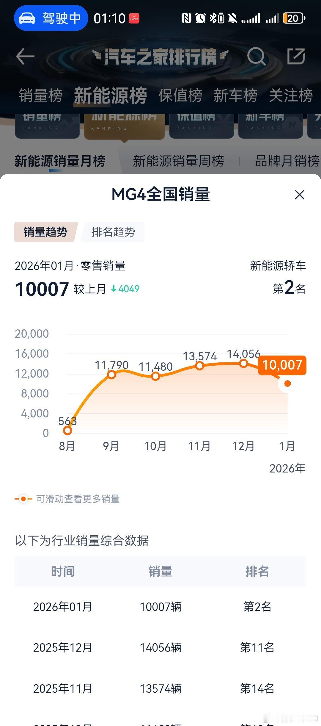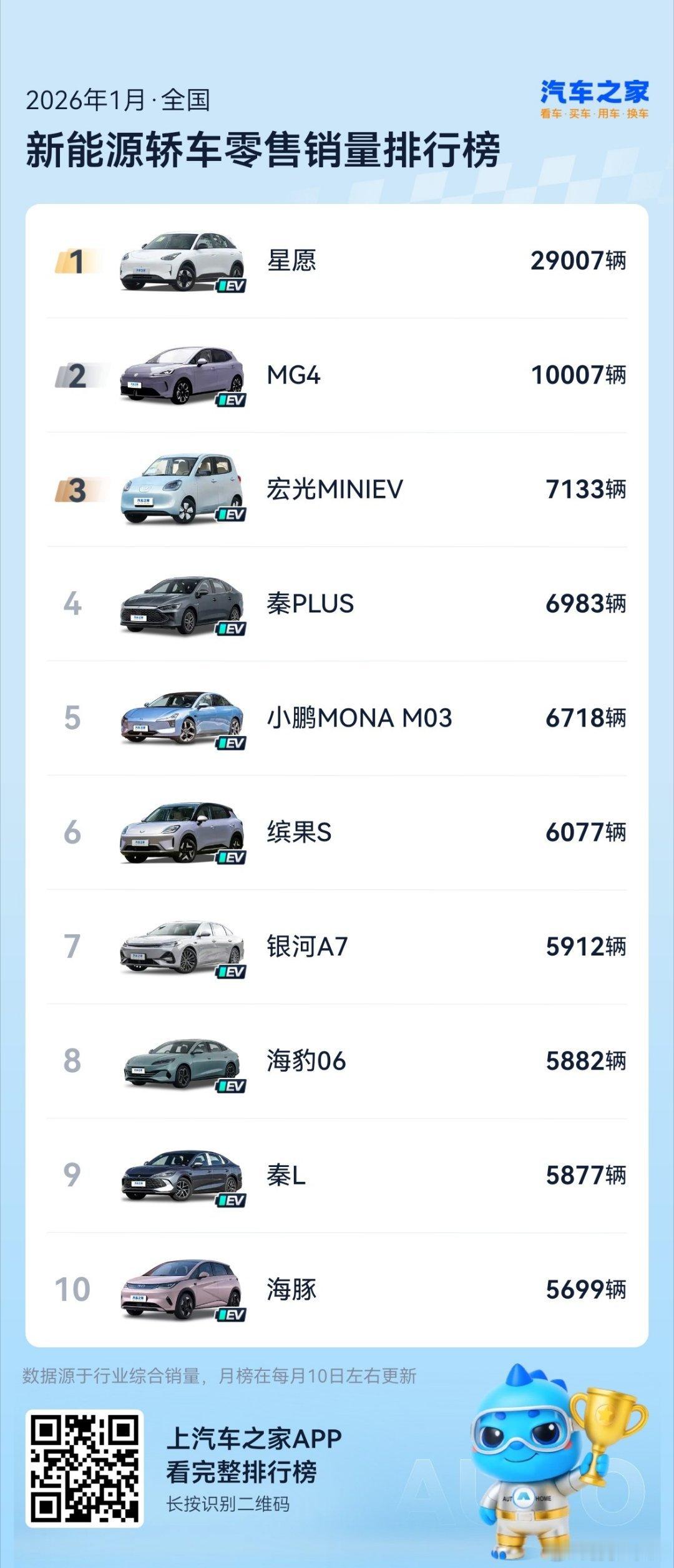 1月新能源轿车销量排行榜吉利星愿例行杀疯,比第二名MG4多了接近2万台MG4也是