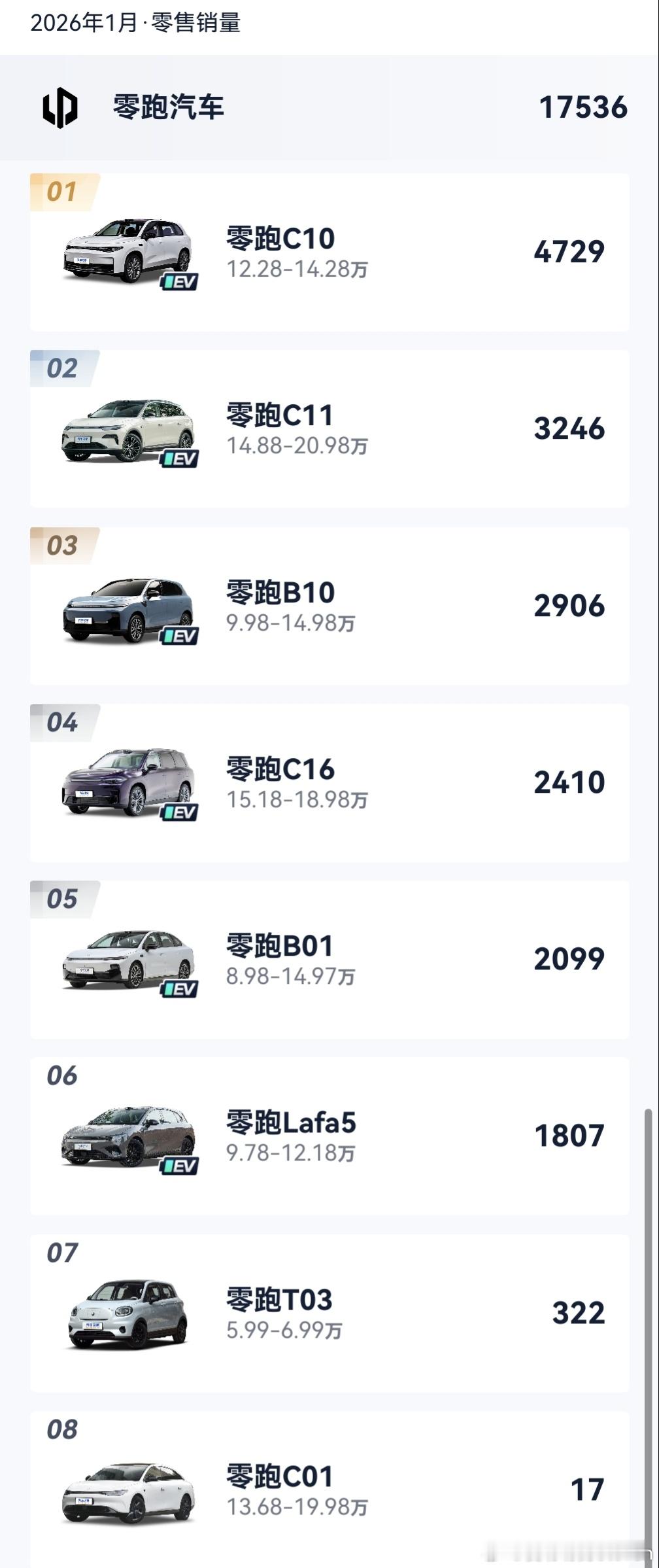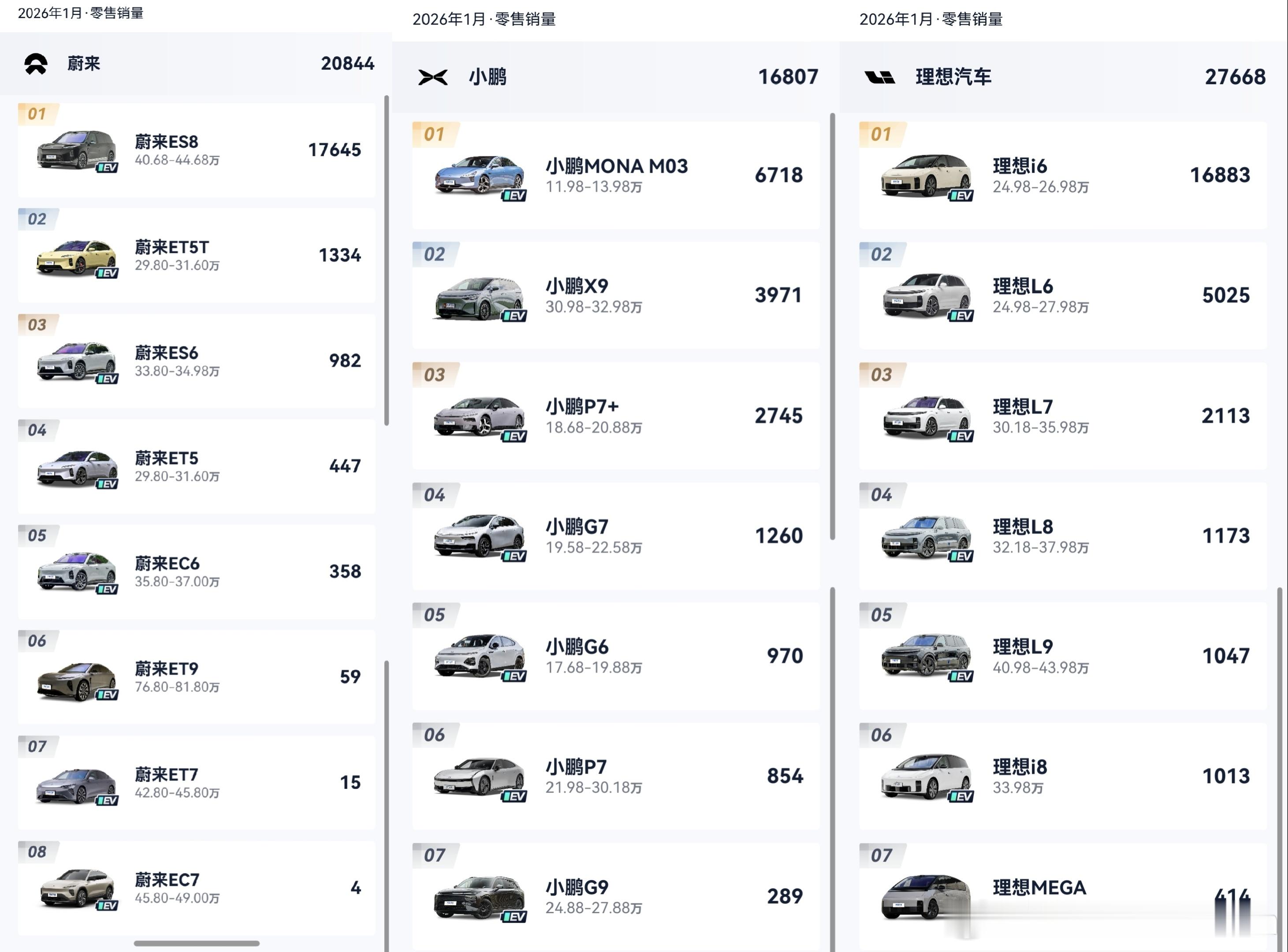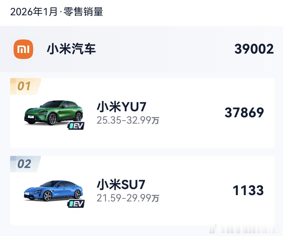 新势力几家大厂1月份销量都有所下滑小米39002,其中Su7 1133。零跑17536,蔚来20844,ES8 17645有点猛。小鹏16807,M03 6718占大头。理想27668,i6 16883/L6 5025。这么一看感觉还挺清楚的。大v聊车