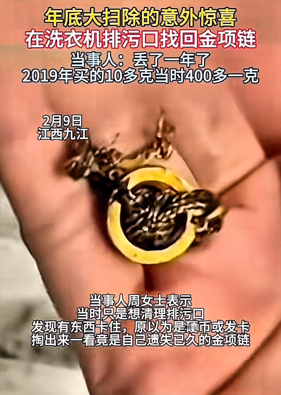 没想到啊! 江西九江一女子大扫除,竟在洗衣机排污口,捡回了丢失一整年的惊喜!͏ 本以为这条金项链,彻底弄丢,再也找不回来了,女子心里遗憾了很久。 谁能想到,年底清理洗衣机这个最容易被忽略的小角落时,一掏出来,正是那条消失一年的金项链。 那一刻的意外、开心和幸运,真的难以形容。 有时候生活就是这么可爱,你以为失去的东西,其实只是换了个地方等你 。失而复得的快乐,往往比拥有时更让人珍惜。 你们有没有过这种丢了很久、却突然失而复得的经历?评论区说说~ 信息来源:半岛晨报