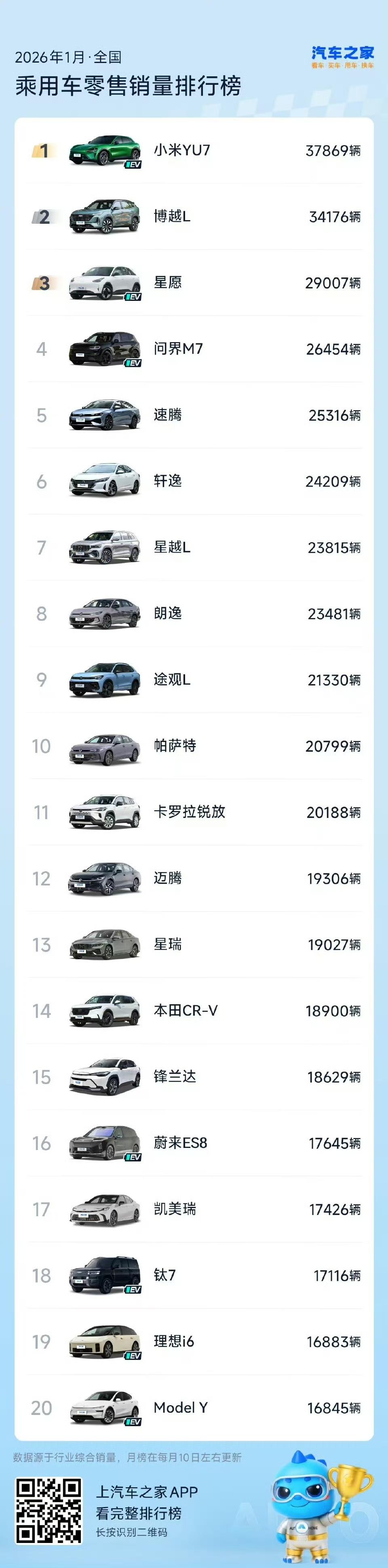 我是不是眼睛花了,没有定语,小米YU7在2026年一月乘用车销量第一,遥遥领先! 这是怎么做到的?排行榜可不是野榜,来自汽车之家。 前十的排名如下: 第一小米YU7 37869辆 第二博越L 34176辆 第三星愿29007辆 第四问界M7 26454辆 第五速腾25316辆 第六轩逸24209辆 第七星越L 23815辆 第八朗逸23481辆 第九途观L 21330辆 第十帕萨特20799辆