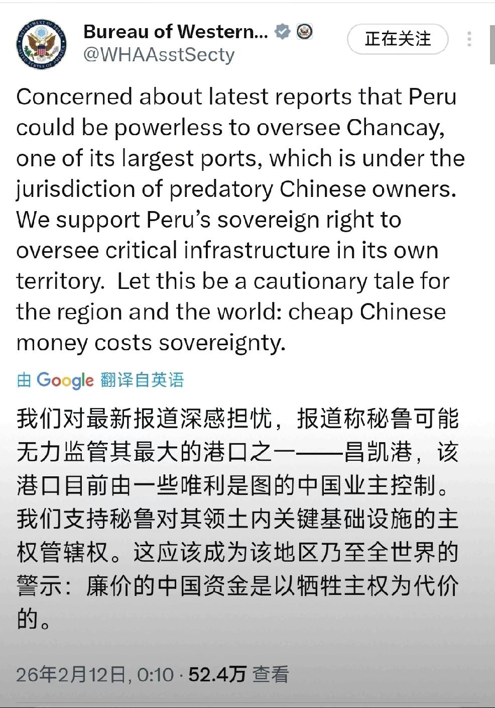 2月12日,美国国务院西半球事务局发文:“我们对最新报道深感忧虑,报道称秘鲁可能无力监管其最大的港口之一钱凯港,该港口目前有一些唯利是图的中国业主控制,我们支持秘鲁对其领土内关键基础设施的主权管辖权,这应该是成为该地区乃至全世界的警示:廉价的中国资金是以牺牲主权为代价的。” 个人认为:看来美国是又在用老套路,颠倒是非,恶意抹黑中国。 为何美国突然提起秘鲁钱凯港?因为中国货船已经不再经过巴拿马运河,改道秘鲁钱凯港运送货物。 所以美国只能运用老套路— 威胁与挑拨,恶意破坏地区合作。 美国试图把拉美地区看作自己的后院,只允许自己霸权,不许他国合作的强盗逻辑,这种霸权逻辑显然是行不通的,绝不允许的。