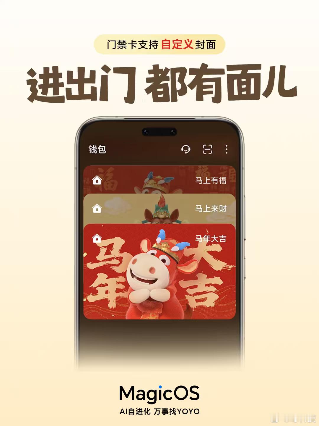 新年新气象,是时候为你的日常加点仪式感了!这次我发现了荣耀钱包的一个隐藏玩法——NFC门禁卡居然能DIY专属卡面!我立刻给我的门禁卡换上了动态骏马迎春主题,金色流云配上奔腾的生肖马,每次刷卡时骏马扬蹄跃动,寓意“马到成功”,科技感与年味瞬间拉满!现在每次回家开门都多了一份期待,仿佛握着一枚小小的幸运符。你也快来定制专属的“马上好运”卡面,让科技为生活添一份喜庆吧!