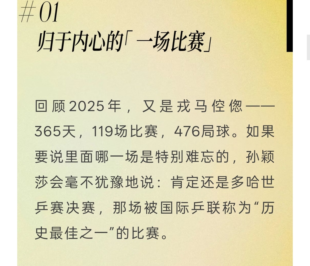 孙颖莎ELLE网页链接【归于内心的一场比赛】“回顾2025年,又是戎马倥偬——365天,119场比赛,476局球。如果要说里面哪一场是特别难忘的,孙颖莎会毫不犹豫地说:肯定还是多哈世乒赛决赛,那场被国际乒联称为“历史最佳之一”的比赛。时间又过去了半年多,强烈的情绪早已平复,新的故事也在不断被书写。但这场比赛的经历,这个瞬间的感受,这座奖杯所意味着的种种,都将归于她的内心深处,并且一直停留在那里。”