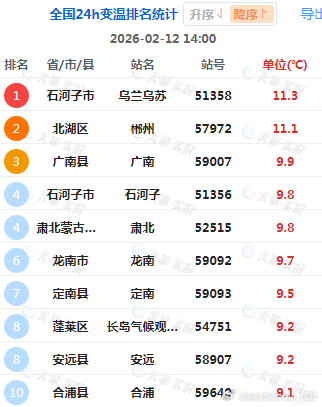 【升温】今天我国大部地区气温回升,14时0℃线已经北抬到了黑龙江西南部,达到了今年以来最北。14时升温榜上,天南海北的站点齐聚一堂。新疆乌兰乌苏升11.3℃、湖南郴州升11.1℃、云南广南升9.9℃、甘肃肃北升9.8℃、江西龙南9.7℃、山东长岛升9.2℃、广西合浦升9.1℃,为各省区14时升温最强站点。
