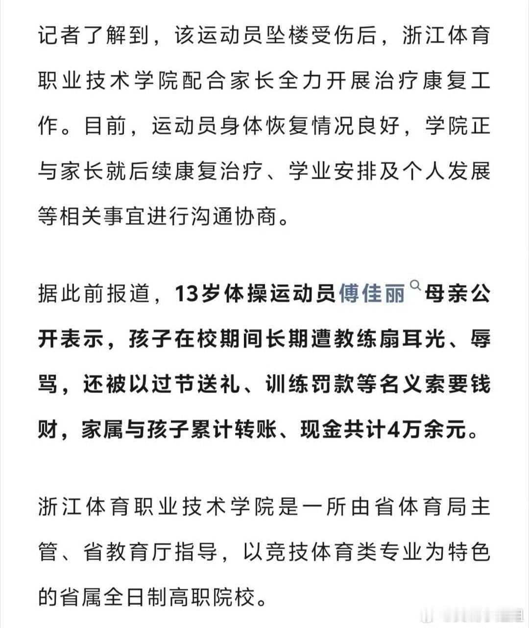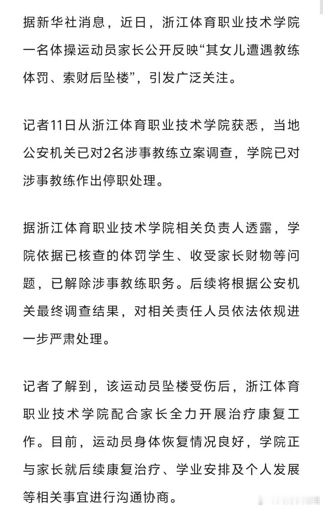 体操运动员坠楼涉事教练被立案调查太可怕了😱还是那句话,“土方法”这个词之所以被冠在很多“打骂体罚”的教育方法上,是因为它真的是“土”,且不说甚至还过节索要钱财,单说“打骂体罚”这件事,我一直认为,你打出来的天才,不是身心健康的天才