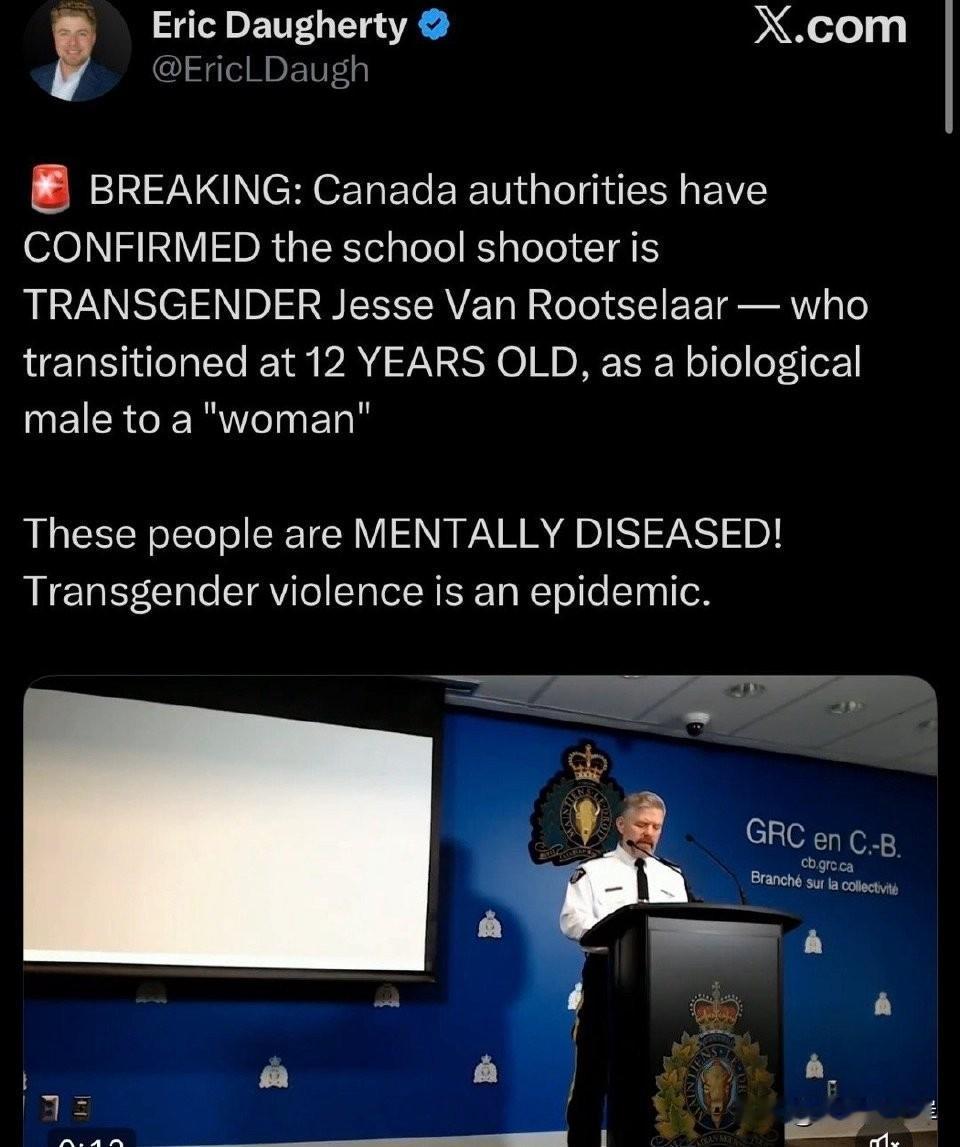 🚨突发消息:加拿大当局已确认,该校园枪手是跨性别者 Jesse Van Rootselaar ——此人在12岁时就从生理男性“转变”为“女性”。 这些人患有精神疾病!跨性别暴力是一种流行病。