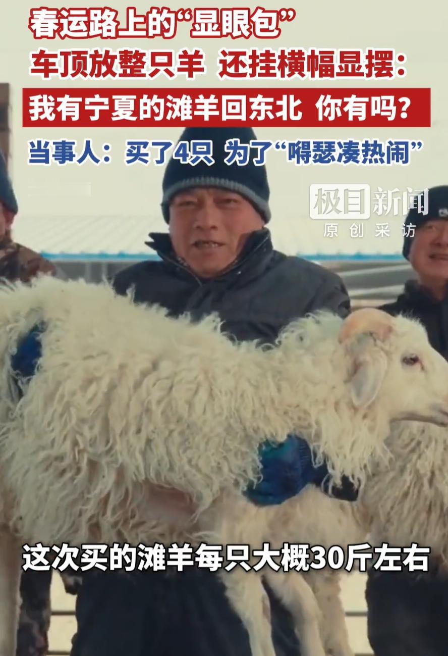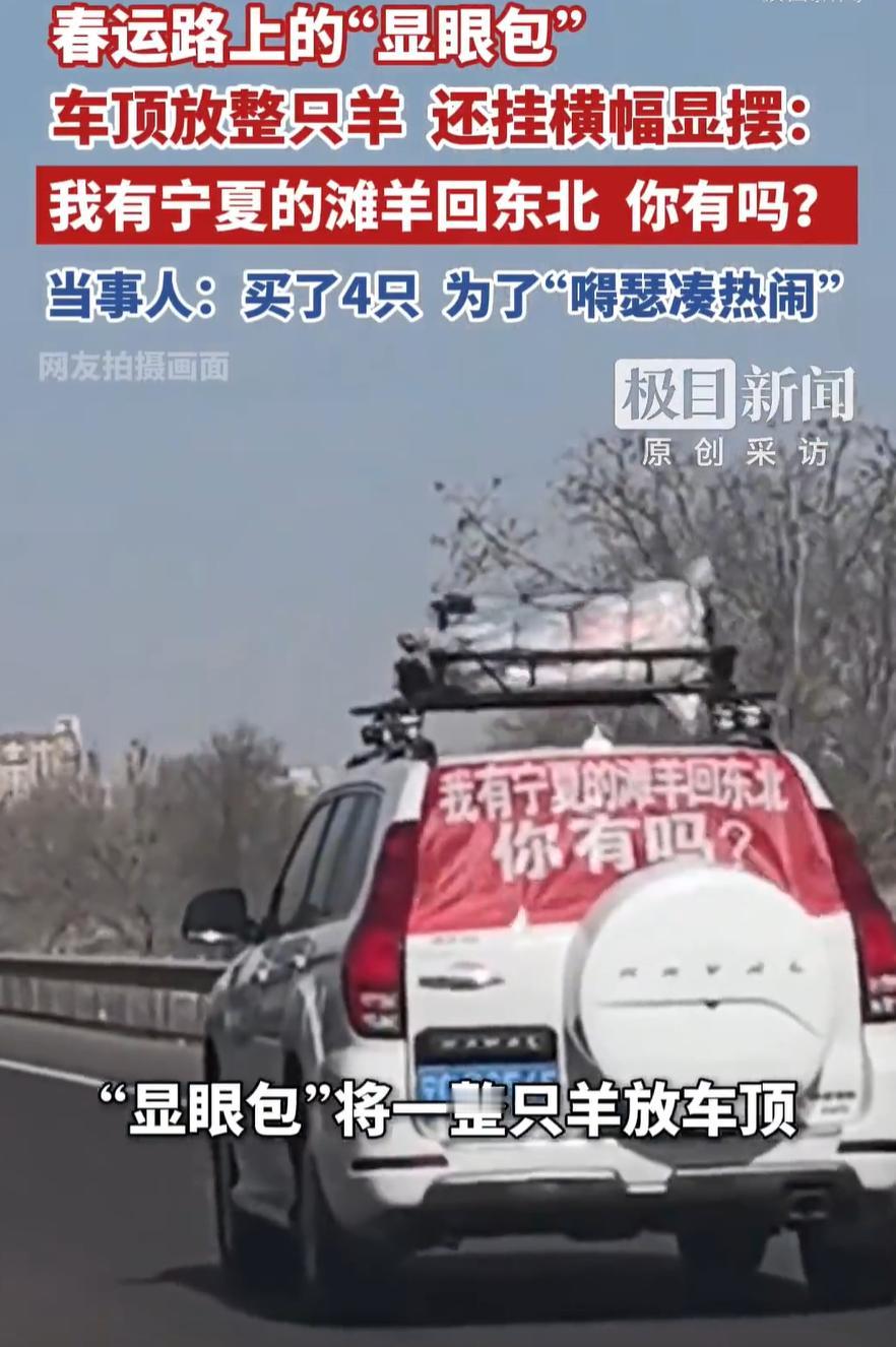 这宁夏文旅必须表示一下!一女子开车从宁夏回黑龙江过年,不过她并不是空着手回去,而是将一整只羊放到车顶,还专门挂了横幅“显摆”买到了宁夏的滩羊,不少人可是一路看的流口水 视频是从一辆行驶中的私家车后座拍的,前面的车顶白花花趴着一只羊,四蹄朝天,收拾得干干净净。更招摇的是车尾挂了条红底白字的横幅:我有宁夏的滩羊回东北,你有吗? 有人把这场景发到网上,配文说:一路开车,一路被问,这羊卖不卖 这位高调显摆的车主姓姜,宁夏人,嫁到黑龙江十几年了。今年春节,她和妹妹两家子一块回了趟宁夏,走的时候后备箱不够用,干脆把一只滩羊固定在了车顶,另外三只仔细封装好,塞进另一辆车 一斤34块钱,一只三十来斤,四只羊花了四千出头。她说这价格不算便宜,但值 其实宁夏媳妇往东北带滩羊,这事儿她已经干了十几年。早些年还只是自己家吃,后来亲戚、邻居、朋友尝过,都追着问明年还回不回去,能不能帮着带一只。慢慢地,春节回宁夏,就成了她一年一度给东北亲友发福利的固定任务 今年搞这么一出,她说就是图个乐呵,嘚瑟一下,也给宁夏滩羊打个活广告 广告确实打出去了。视频底下有人算账,说连羊带车顶运费,成本不低;有人说看了视频专门去买了滩羊,贵是贵,但确实没膻味;还有人说,这不是显摆羊,是显摆娘家 这话倒是点到了关键 在外地人看来,这是一则关于地方特产的种草帖。但在西北和东北两头跑的人眼里,这根本就是一个远嫁女儿一年一度回娘家的骄傲宣言 嫁出去十几年,口音变了,生活习惯变了,社交圈也变了,但她回宁夏买羊、绑羊、挂横幅、一路开回东北这套动作,每年雷打不动。羊是带回去吃的,横幅是挂给路人看的,那股子劲儿,是给自己提气的 宁夏滩羊这些年确实出名了。资料上说,这个品种是在宁夏独特自然条件里培育出来的,养殖历史很长,肉质公认的好。以前是本地人偷着乐的特产,现在电商、冷链、物流一跟上,外地人也能吃到了 但像姜女士这种原始人肉背回的方式,反倒更有说服力。冷链车能送一集装箱羊肉到东北,但送不动一个人在故乡买了十几年、绑在车顶也要带回去的那股劲儿
