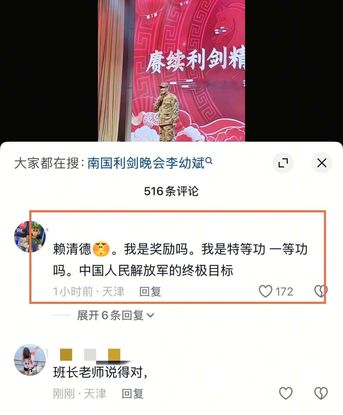 “李云龙”发话了,看来这次赖清德跑不了了。 日前,南国利剑晚会特地邀请到了知名演员李幼斌,作为老戏骨,演艺圈的艺术家,他塑造的“李云龙”这一形象可谓是非常精彩,几乎是跨越了好几个时代的记忆。 至今看,仍然让人热血澎湃。 曝光的画面中,李幼斌身穿迷彩服,讲话的时候,他这样感慨:到时候你们万一,万一,这个机会留给你们,把这个赖清德替我斩首了。 当其说出这番话的时候,坐在台下的军人齐齐鼓掌,这就说明了一个问题,台湾省回归是众望所归,也是民心所向。 不愧是人民的艺术家,看来他日常很关注两岸的状况,尤其是台湾省赖清德的“德行”,有“亮剑”精神 的加持,相信要不了多久,台湾省就会回归,而赖清德也将被钉在耻辱柱上,余生承受法律的制裁,道德的审判。 其实,老一辈的艺术家一直都有这种家国情怀,想来这也是邀请其参加晚会的原因之一。