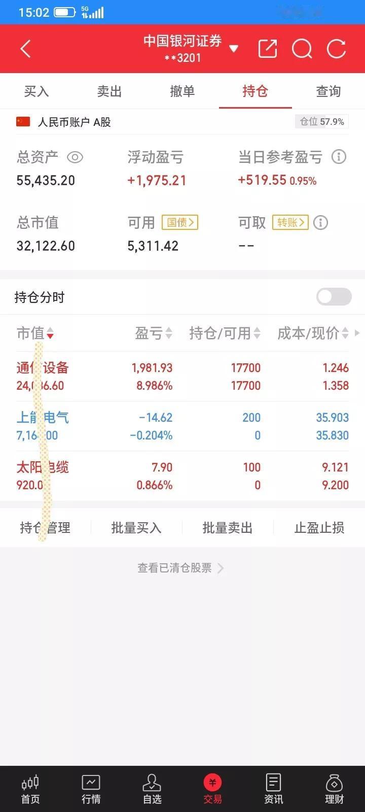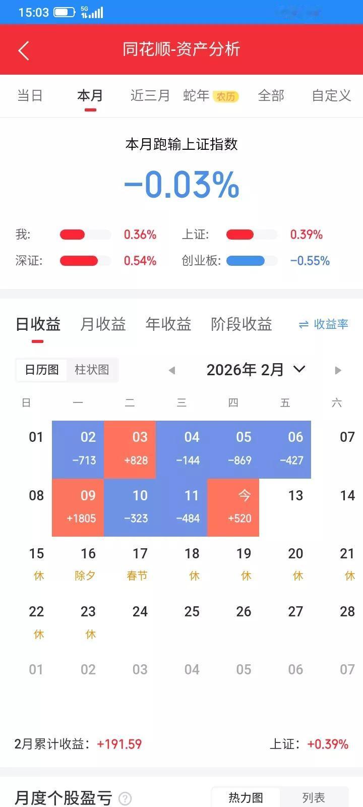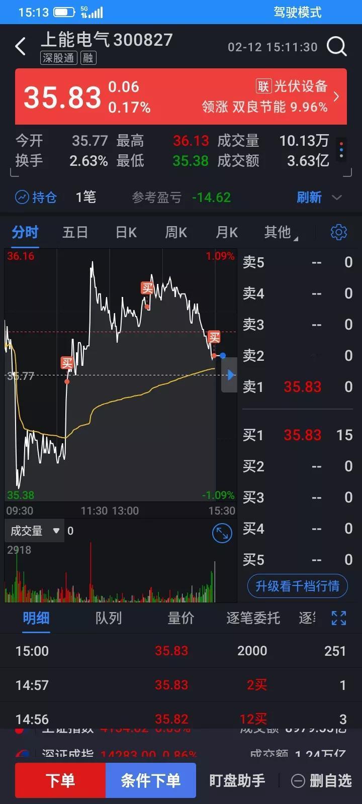 2026.02.12,今天上证指数小幅波动,始终翻红,我持有的etf今天反弹了,把昨天亏掉的勉强赚回来。看盘就总是管不住手,禁不起诱惑,又怕错过了,追着买,没有买入就一直不下跌,好不容易下定决心,高价买入了,反弹一点点,收盘前又跌下来了,又买贵了,多亏了十多块钱。 太阳今天高开低走,触底反弹,预估今天应该要上涨了,反弹到开盘价,于是以开盘价9.12买入100股,买入之后下跌了一分钱,然后快速拉升,一下子冲高到9.37,但是拉高诱多,收盘又跌下来了,只是没有跌破我的买入价,浮盈7块钱。 上能低开高走,快速跳水,胆小不敢买,最低跌到35.38元,然后逐步反弹,然后大幅拉升,想等回落到35.70买入,但是却一去不返,一路上涨,冲高到36.13,然后逐步回落,一直跌不下来,于是又追高以35.97买入100股,成交之后反弹了一点点,收盘又跌下来了,没有管住手,又多亏了14块钱,收盘还是阳线,以35.83再补仓买入100股。今后还是不看盘更好,错过了就算了,要严格执行计划。 etf,1.332开盘就逐步上涨,最高冲到1.368,然后逐步回落,忽略盘中波动,收盘以1.358卖出2500股,赚60块钱波动的差价,知足吧。上涨就按比例卖出,下跌就按比例买入,涨跌都只是浮盈浮亏,赚波动的差价,虽然少,但是是实实在在的利润。 今天总市值3.2万元,总资产5.54万元,今天总体账户反弹回本519元,把昨天亏的赚回来。希望明天好运。