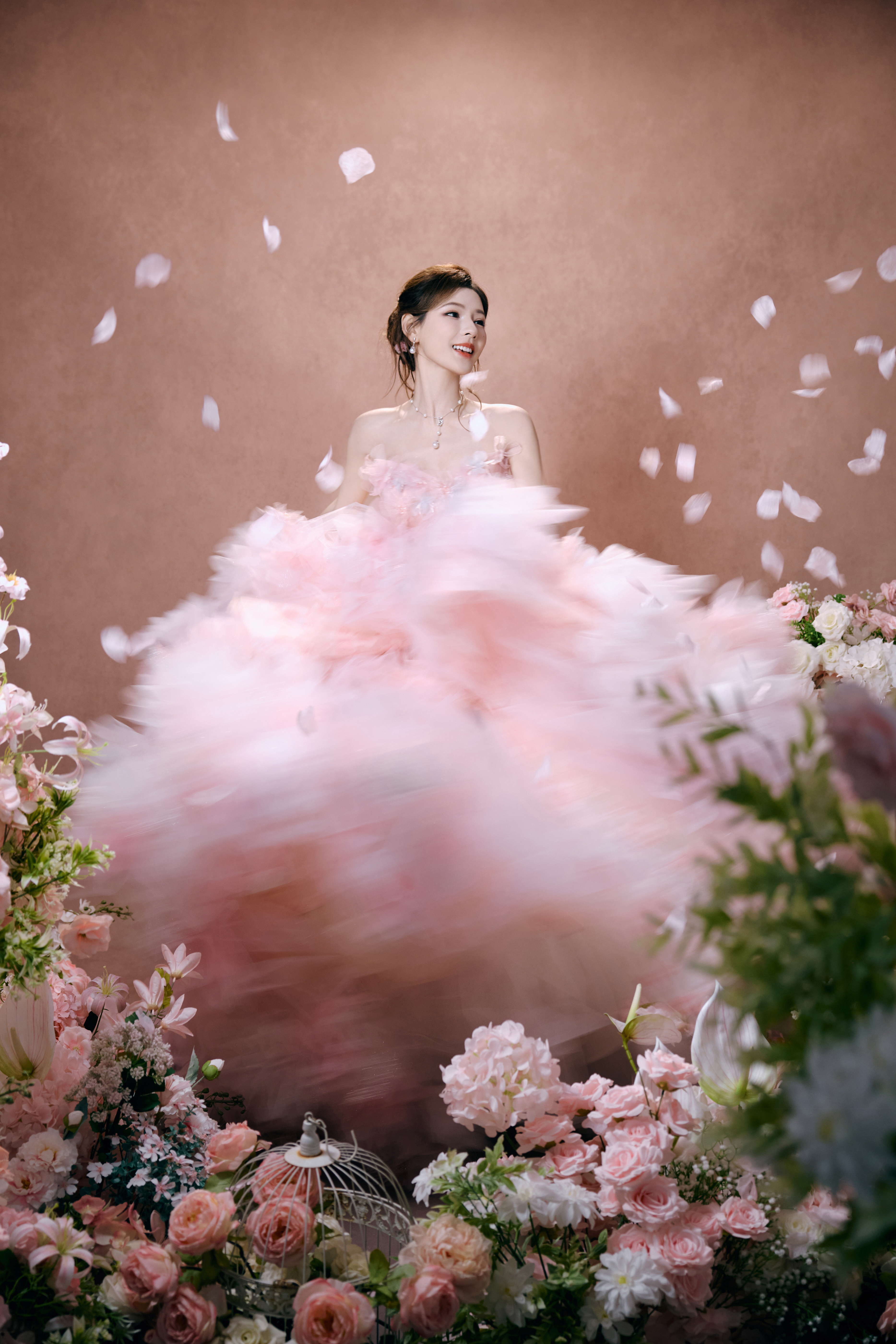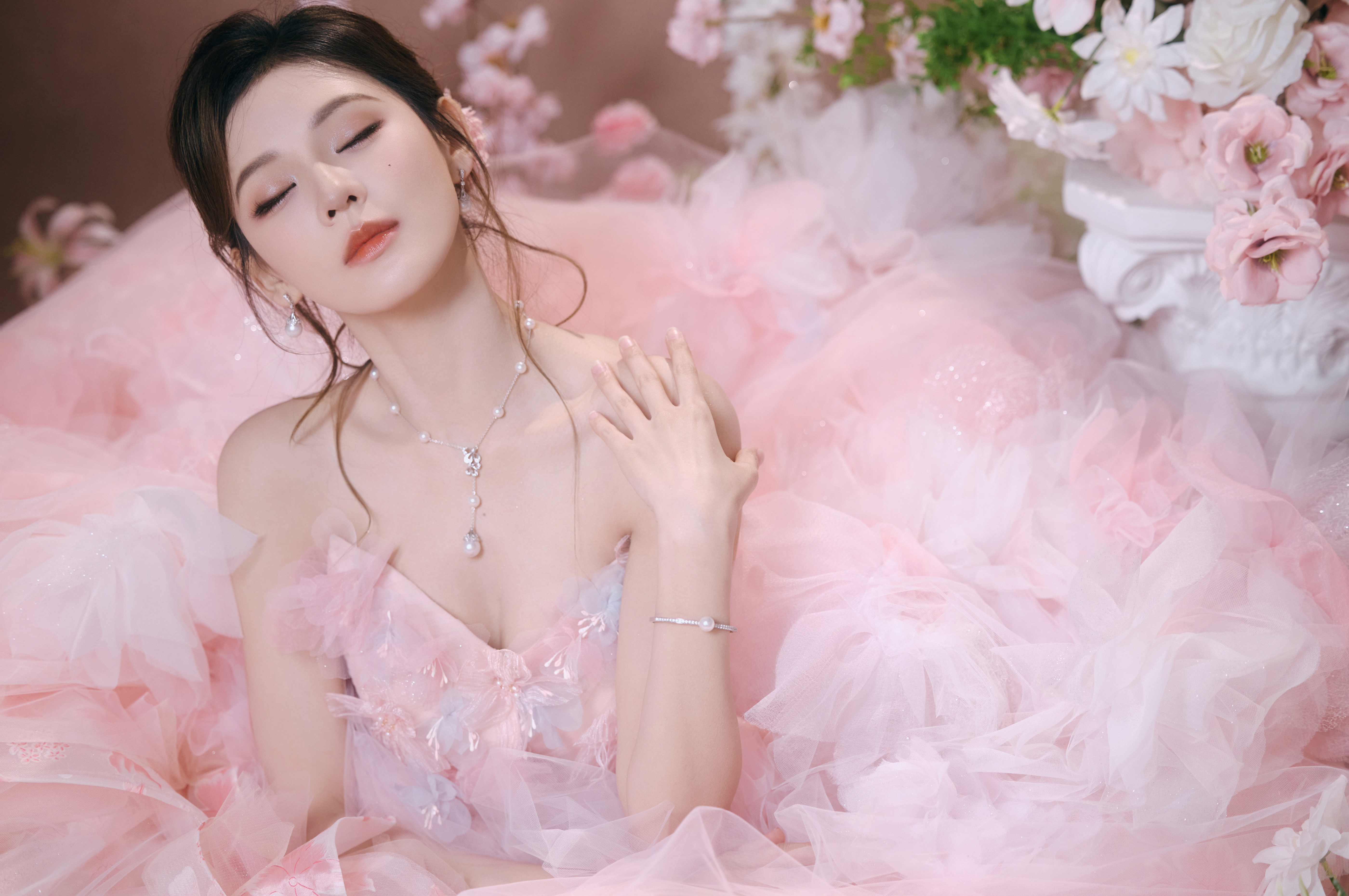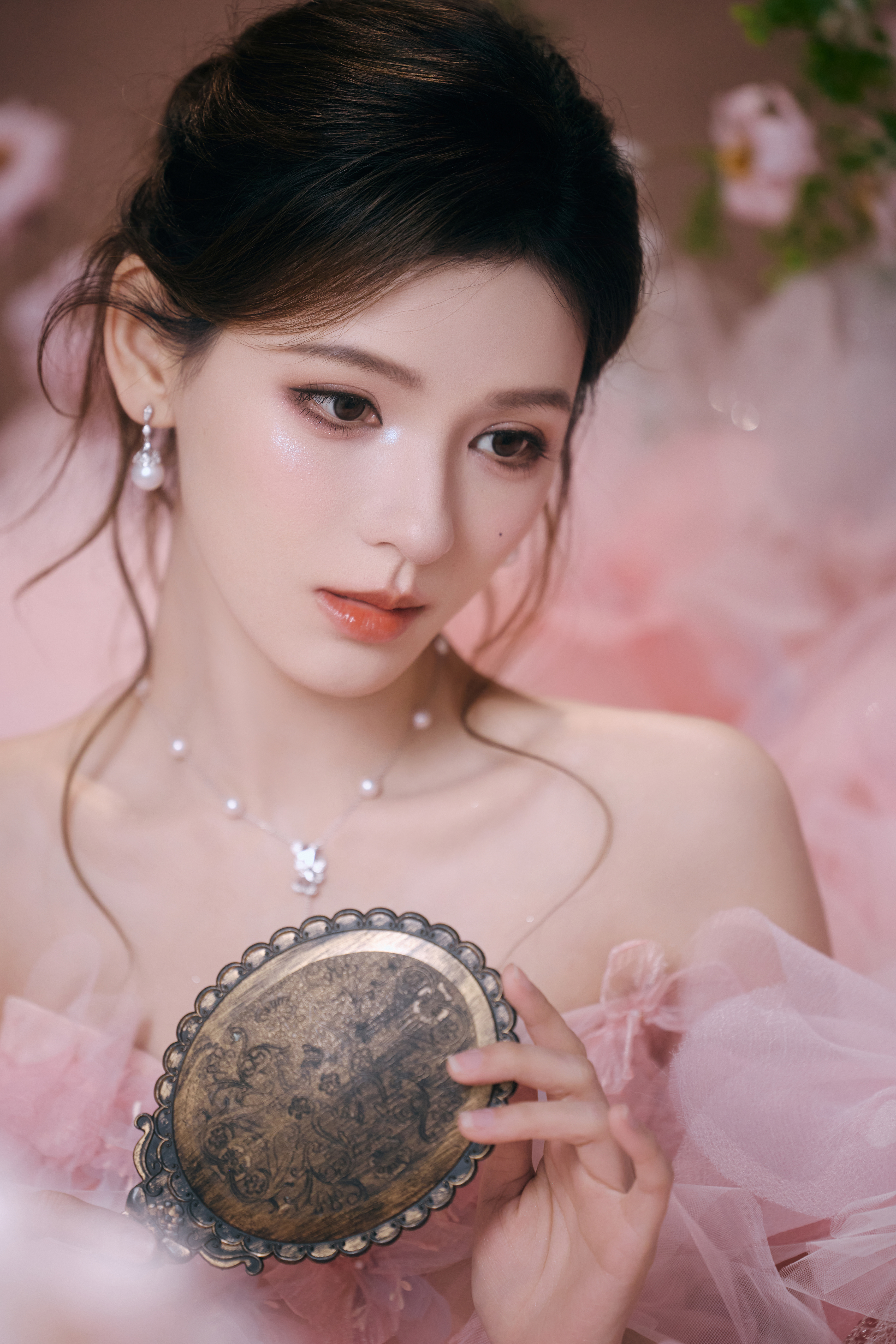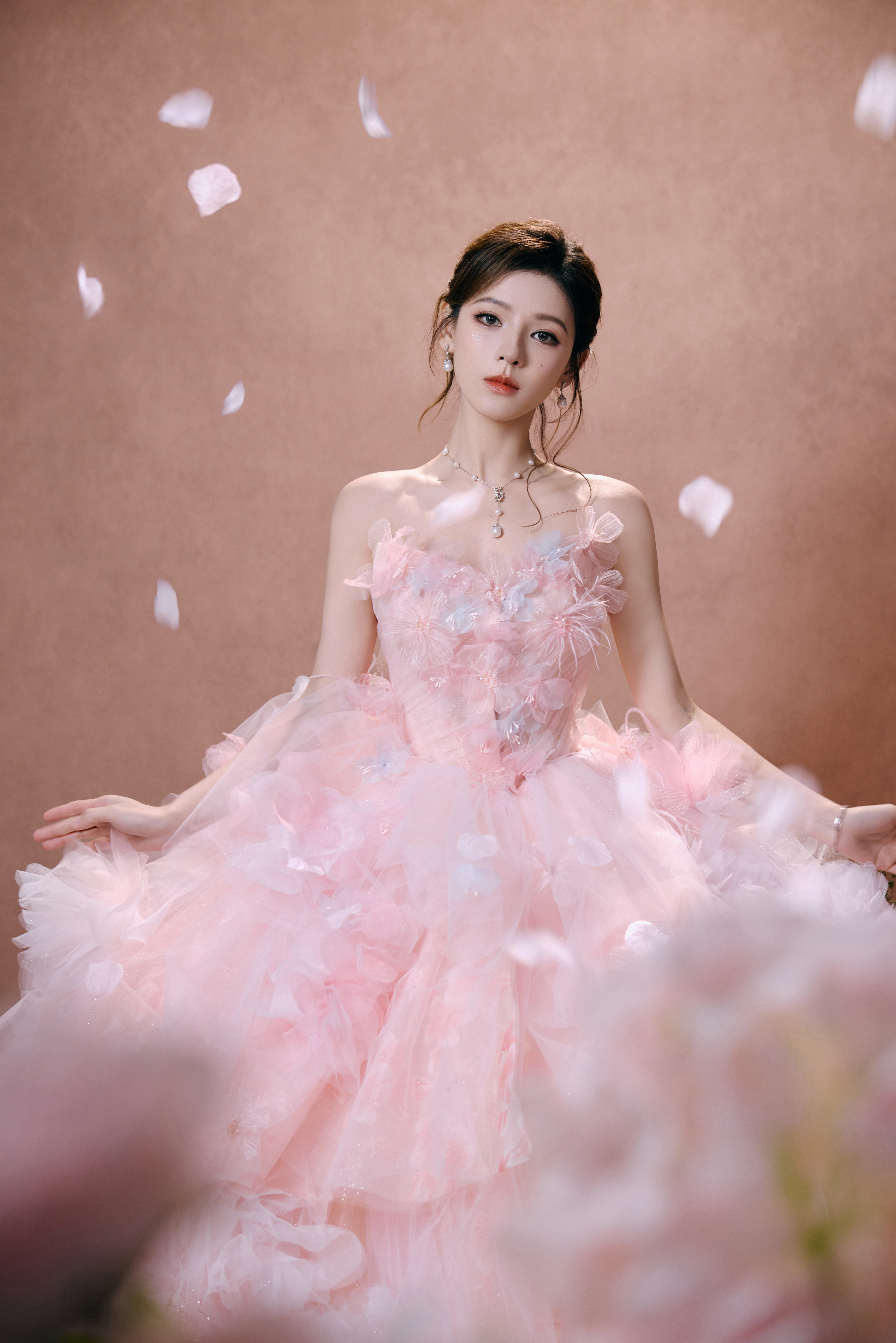 镜头定格的瞬间,是粉色梦境里的一场出逃。花簇、纱裙、温柔的光,都是美好的寄语。张予曦