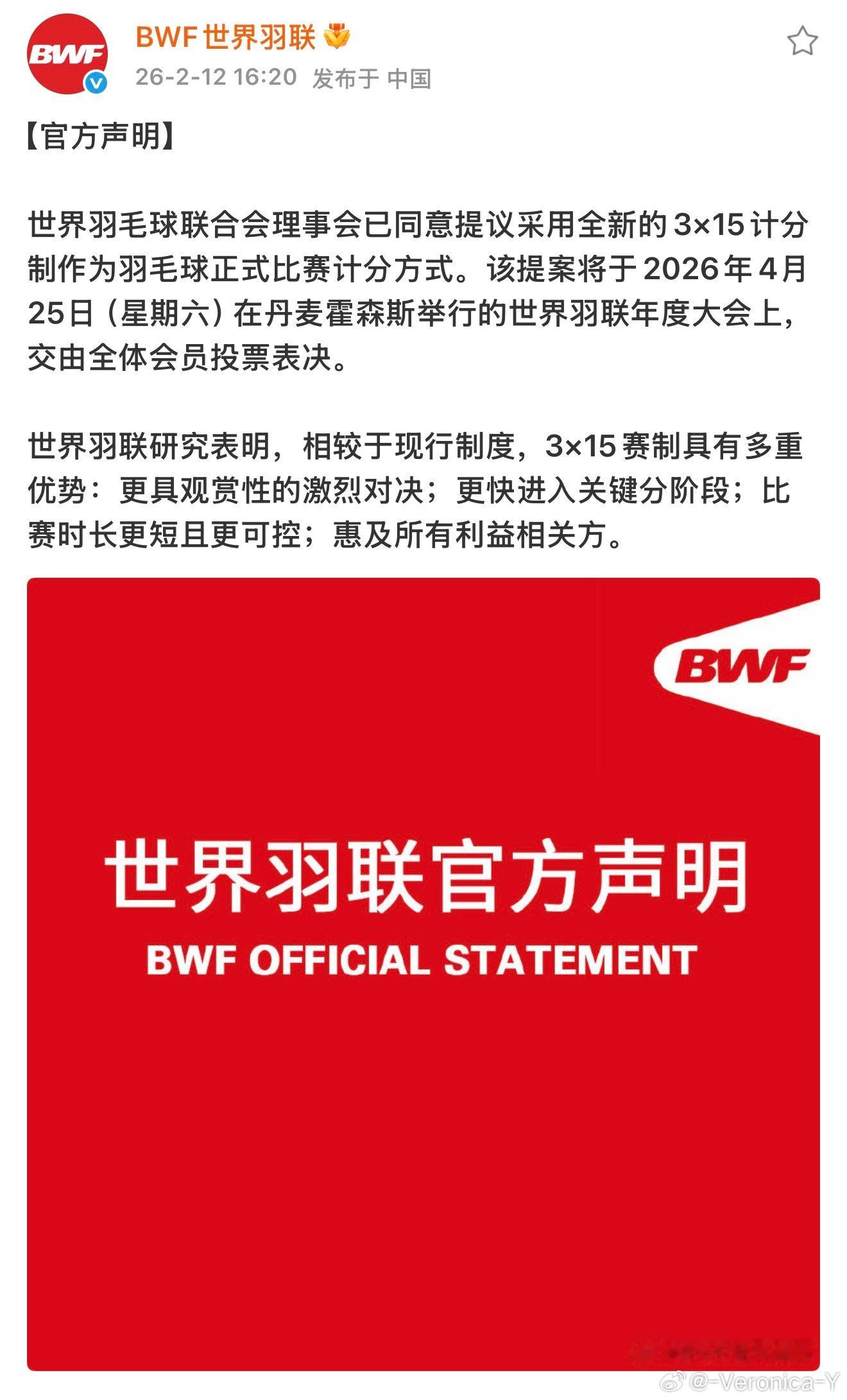 羽毛球比赛有可能变成3×15制4.26的世界羽联大会将投票决定是否执行此制度
