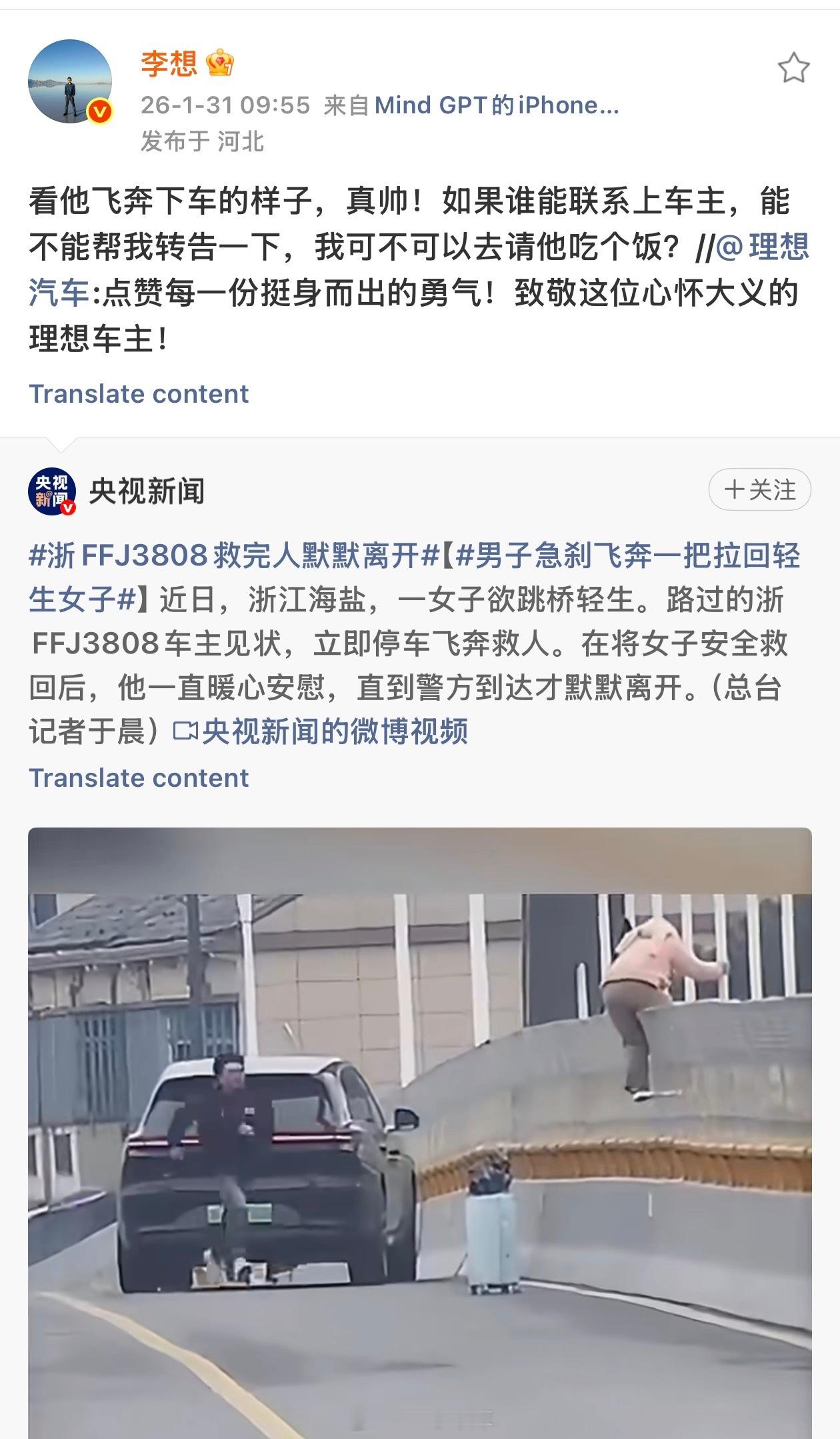 李想今天请客吃饭,顺便送了一辆车。左边是之前救了一位想要跳桥轻生女士的理想车主