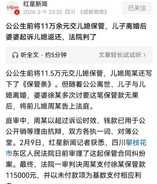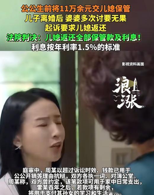 “贪心不足!”四川攀枝花,老人将自己的115000元存款交给儿媳保管,老人去世,女子并没有把钱还给婆婆,她本以为事情就这样过去了。可她和丈夫离婚后,前婆婆一纸诉状将女子告上法庭,要求她返还115000元,女子却说:保管条已经写了8年,过了时效了,另外双方曾约定,这钱用于家庭开销,自己之前带公公出去旅游等,已经花了不少钱了,剩下的是留给自己女儿的。可法院却给出了不同看法。 这是一起实实在在的家庭保管纠纷,说起来事并不复杂,但把这里面的亲情、金钱和法律关系那是捋得明明白白。 一位老人因为相信自己的儿媳妇,就把辛辛苦苦攒下的11万5千块钱交给她帮忙保管,老人去世以后,这钱也没见儿媳妇还给婆家。 后来儿媳妇跟丈夫离了婚,本以为这事就这么翻篇了,没想到前婆婆那边直接把她告上了法庭,要求她全额把这笔钱给还回来。 老人在世时,那时候老人年纪大了,腿脚不灵便,去银行存取款也不方便,就把自己攒下的这笔养老钱交给了儿媳妇保管。 当时为了稳妥起见,双方还写了一张保管条,上面白纸黑字写得清清楚楚:这钱就是暂时放在儿媳妇那儿保管的,既不是送给她的,也不是拿给家里花的,儿媳妇当时答应得那是相当痛快,说肯定好好给保管着,老人啥时候要就啥时候给。 没过多久,老人去世了,这笔钱也就变成了遗产,按理说,儿媳妇应该主动把钱交出来,或者至少跟婆家提一嘴这事,但这儿媳妇没这么做,她心里可能想着:人都走了,时间一长估计也就没人记得这笔钱了,那这就等于是落在自己手里了。 后来她跟丈夫感情破裂离了婚,更是觉得这笔钱跟前婆家没半毛钱关系了,可以安安心心地留着自己花了。 可她万万没想到,婆婆那边一直记着这笔钱呢,老人去世后,家里人整理遗物的时候发现了那张保管条,这才知道还有这11万5千块钱在儿媳妇手里。 婆婆那边好几次找儿媳妇沟通,想让她把钱还回来,可这儿媳妇要么推三阻四,要么直接拒绝,双方闹得那是相当僵。 实在没办法了,前婆婆就把前儿媳妇给起诉到了法院,请求法院判令她返还这笔保管款,庭审的时候,儿媳妇当场就提出了两条理由来辩解:第一,这保管条都写了8年了,早就过了诉讼时效了,法院不应该再支持这事,第二,当时双方约定这笔钱是可以用来家里日常开销的,她之前带公公出去旅游、平时的生活花费,已经用掉了不少,剩下的部分那是留给自己闺女的,不应该全部还回去。 面对儿媳妇的这些说法,法院给出了完全不一样的看法,法院审理查明,这笔钱确实是老人交给儿媳妇保管的财产,有保管条为证,这就是明确的保管合同关系,既不是赠与,也不是家庭共同开支费用。 儿媳妇虽然嘴上说用于家庭开销、带老人旅游了,但拿不出任何有效的证据来证明双方有过这样的约定,也拿不出任何支出凭证,这就只能自己承担举证不能的后果了。 关于诉讼时效这个问题,法院指出,保管合同并没有约定明确的返还期限,老人的继承人可以随时主张返还。 婆婆那边是在知道权利被侵害后及时起诉的,并没有超过法定时效,儿媳妇以时效已过为由拒绝还钱,这在法律上是站不住脚的。 法院同时认定,这笔钱是老人的个人财产,老人去世后这就属于遗产,应该由合法继承人继承。 儿媳妇作为保管人,在被继承人去世后,负有及时返还保管财产的法定义务,不能因为离婚就免除这个责任,更不能擅自占有、处分这笔钱。 最终法院判决:儿媳妇在判决生效后十五日内,向前婆婆返还那11万5千块钱的保管款,并且还要按照年利率1.5%的标准,支付相应的利息。 这场官司虽然看着是钱的事,其实本质上是对信任与责任的一次大考,亲人之间帮忙管钱,本来是出于亲情和方便,一旦变成了占有和推诿,那不仅伤了感情,还得承担法律责任。 这起案子也给所有人提了个醒:帮家里人保管财物,一定要守规矩、留好凭证;不属于自己的钱,不管过了多久,都不能随便拿。 亲情再近,账目也得清;保管那是情分,返还那是本分,一旦突破了这个底线,哪怕再亲的关系,在法律面前也会被分得清清楚楚、明明白白。 对此你怎么看? 信源:浪涨新闻