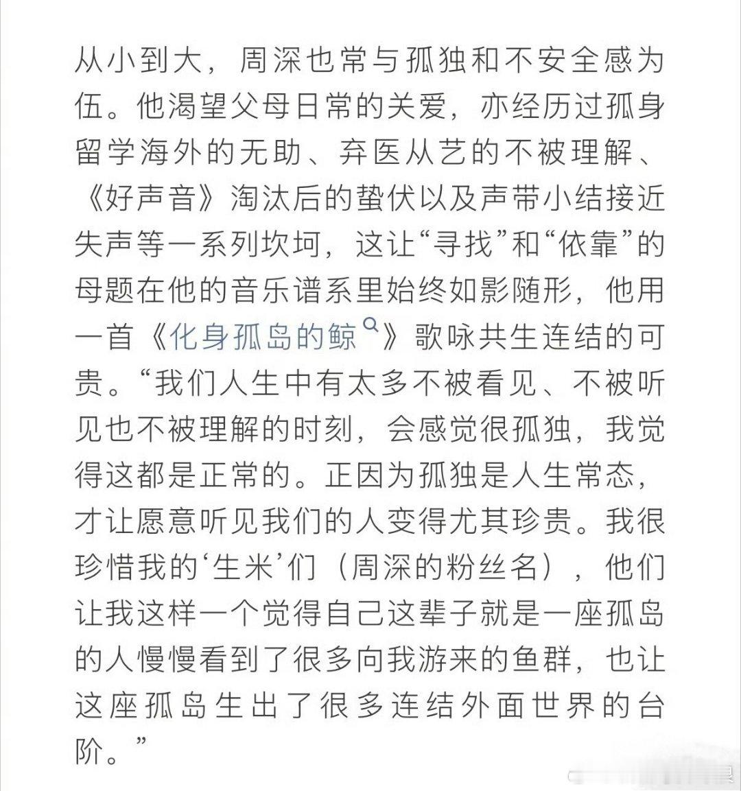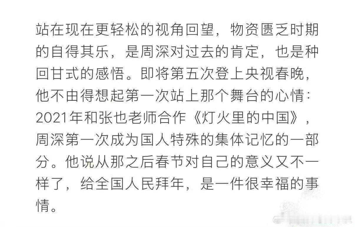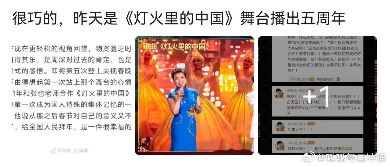 周深回应五登春晚 没有安全感的深深,对春晚已经变得逐渐熟悉,毕竟是上了五回春晚!很巧的是昨天正是《灯火里的中国》舞台播出的五周年。周深在春晚的每一首歌都令人印象深刻,深深的成长经历每一步都脚踏实地!