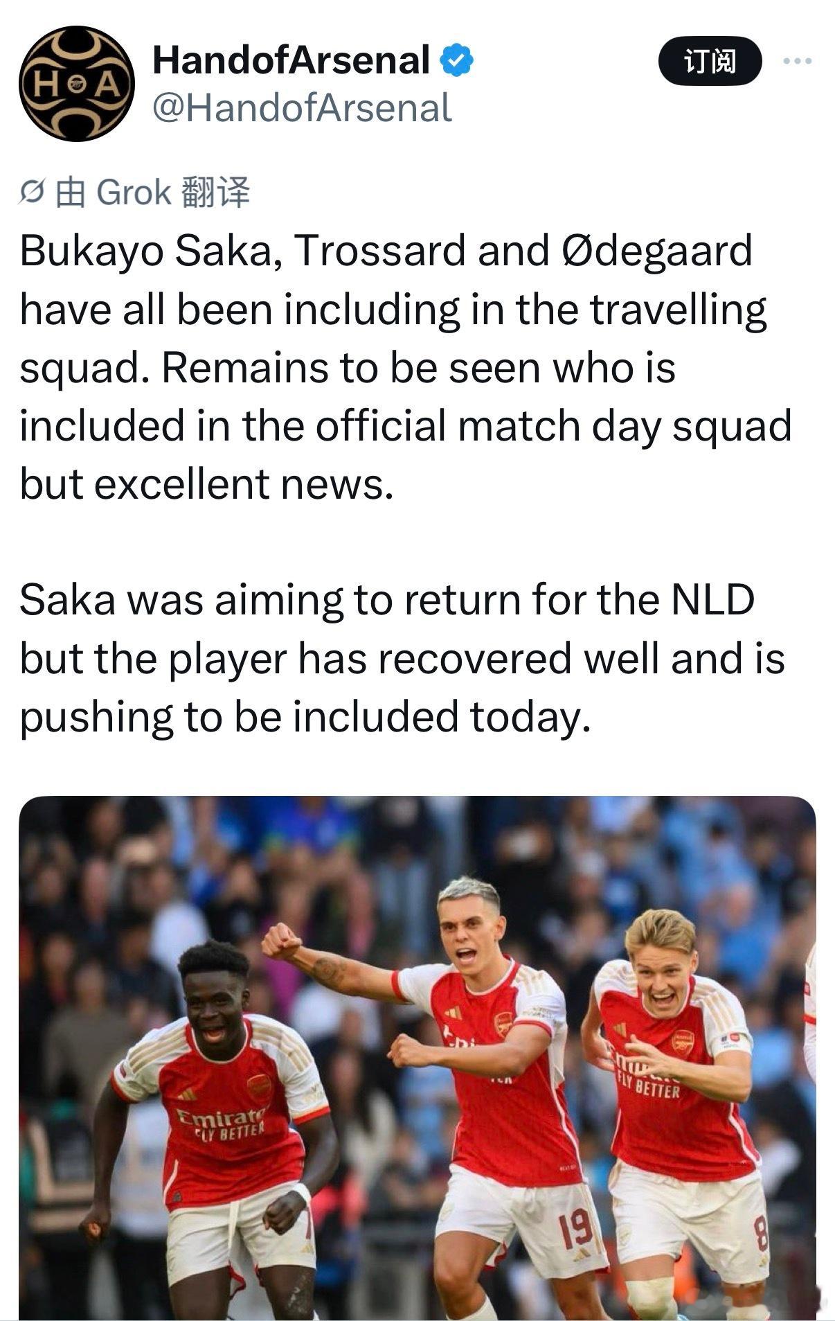 HandofArsenal:萨卡、厄德高、特罗萨德随队出征客场,具体谁能进入今晚大名单有待观察。