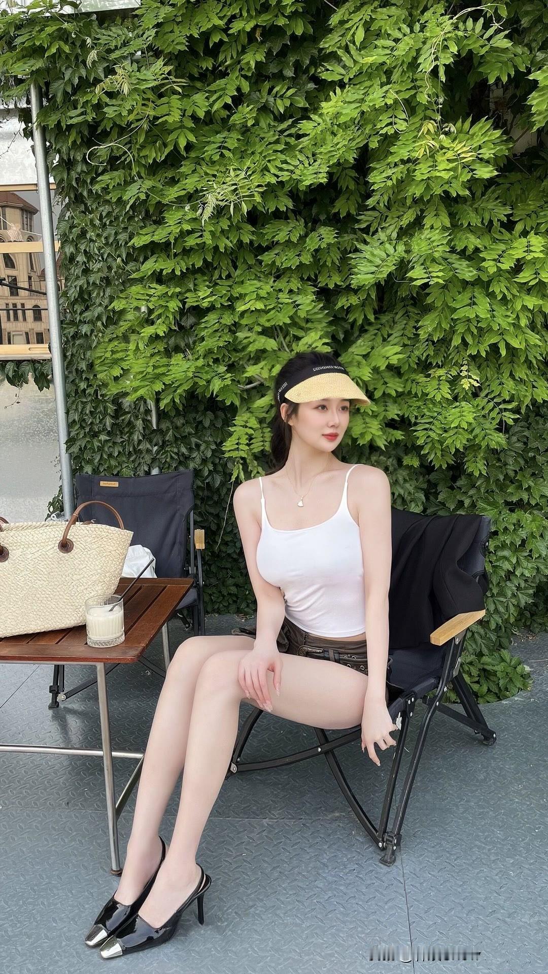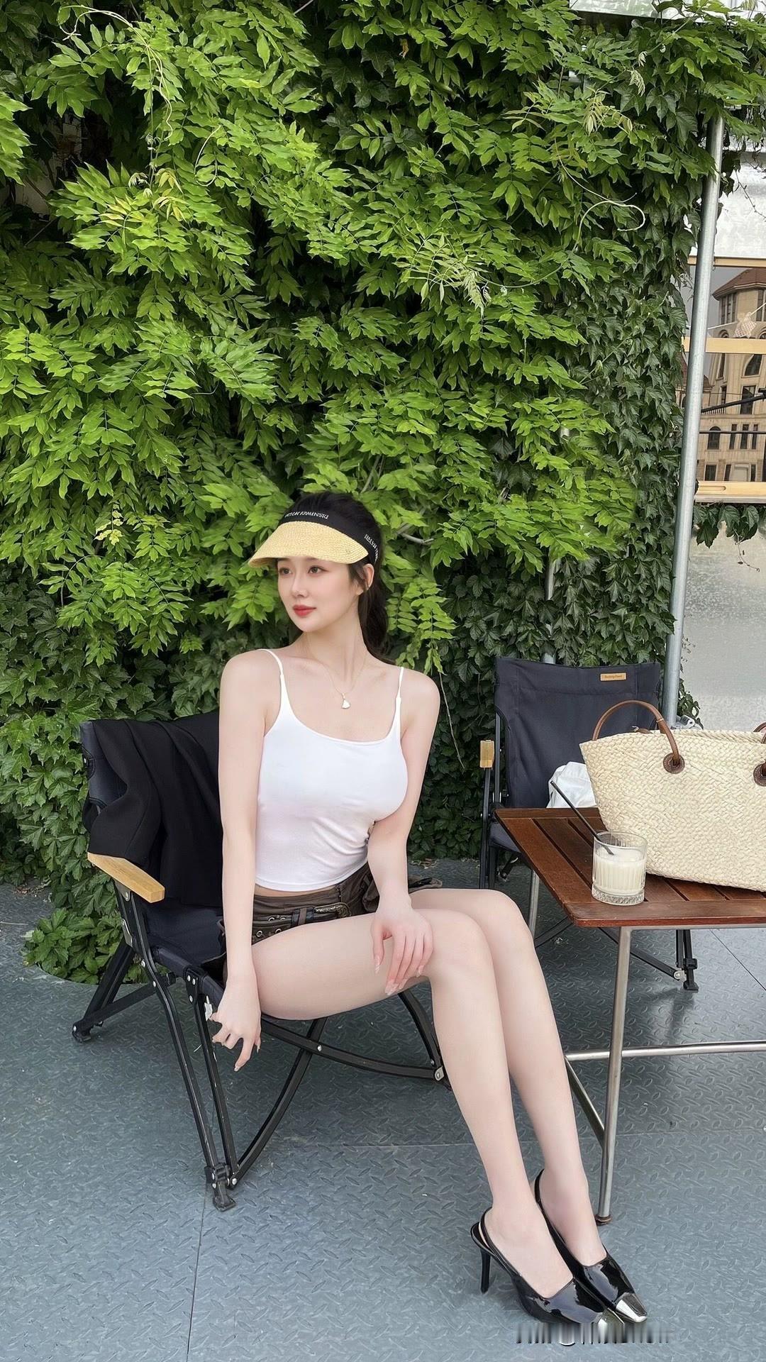 夏日清新穿搭,白色连衣裙搭配自然风景,轻松自在。大长腿