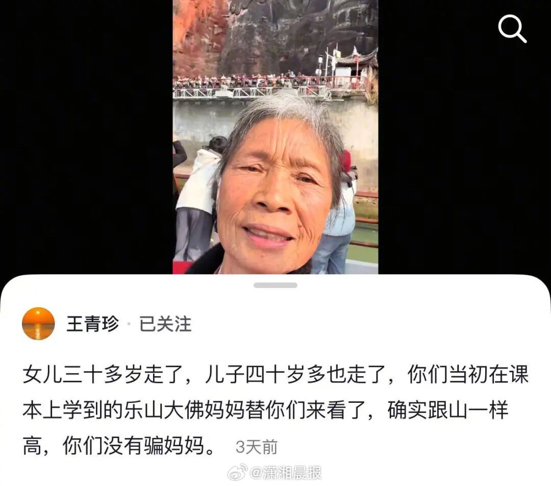 【“和课本说的一样高,你们没有骗妈妈” ,#72岁老母亲替离世儿女看乐山大佛#,网友评论暖爆】#课本上的乐山大佛妈妈替你们来看了#“女儿三十多岁走了,儿子四十岁多也走了。你们初中在课本上学到的乐山大佛妈妈替你们来看了,确实跟山一样高,你们没有骗妈妈。”