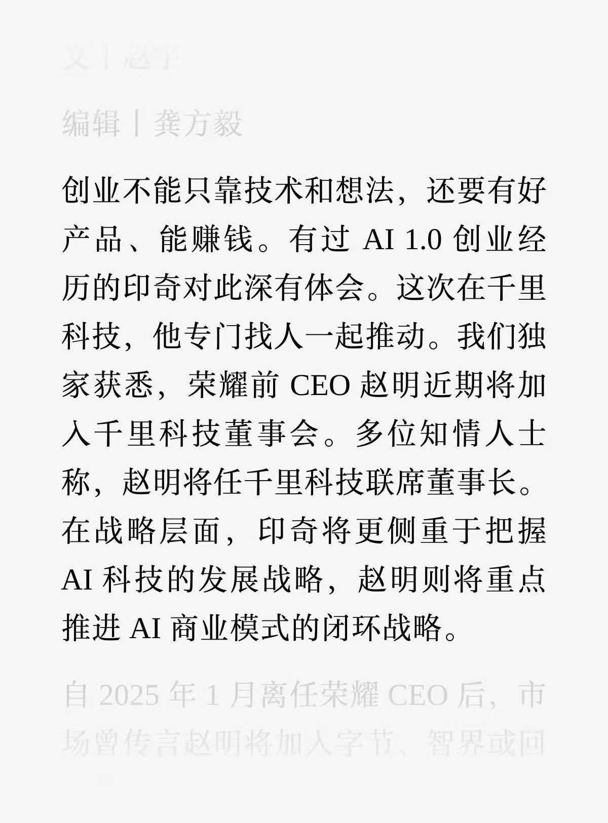 赵明加入千里科技HOW I AI过个有AI年特别有意思。一个被资本教育过的技术天才,一个被市场验证过的操盘手,两个人一起搭档,有点那种既关注现在又专注未来的意味了。